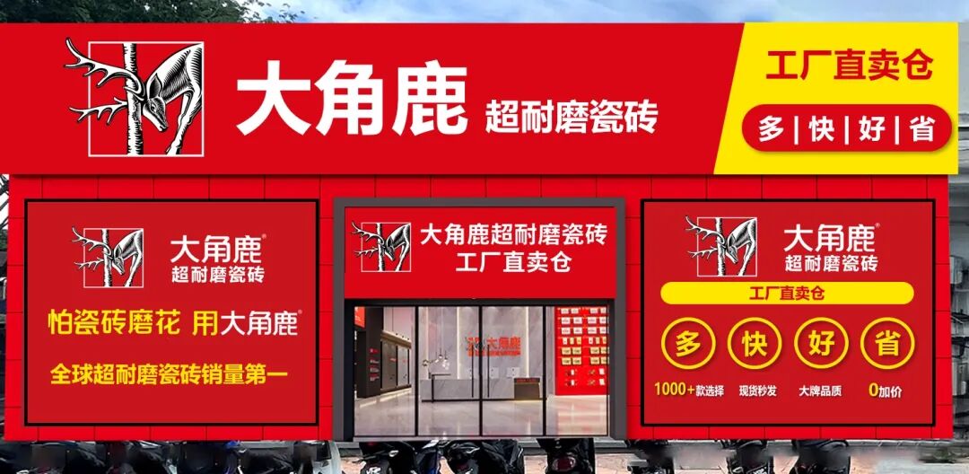 还有一种是工厂直卖仓的模式,强调性价比和快速供货,抢占刚需市场。大角鹿在2025年7月推出的“超耐磨瓷砖工厂直卖仓”模式,以“前店+后仓”的创新结构,这种店态通常会配置600㎡以上展厅和1000㎡以上仓储,实现现场选品、即时提货。