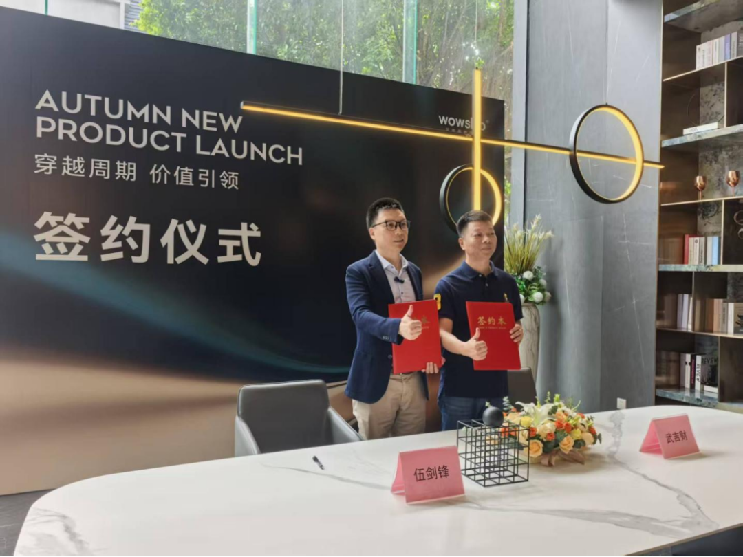 本次发布会的两大签约仪式,成为华岩品致布局未来的重要见证。伍剑锋董事长先是与汤洁明总经理共同签署总部展厅扩容协议,他表示:“展厅扩容是品牌实力提升的直接体现,未来将为客户呈现更完整、更专业的岩板空间解决方案。”