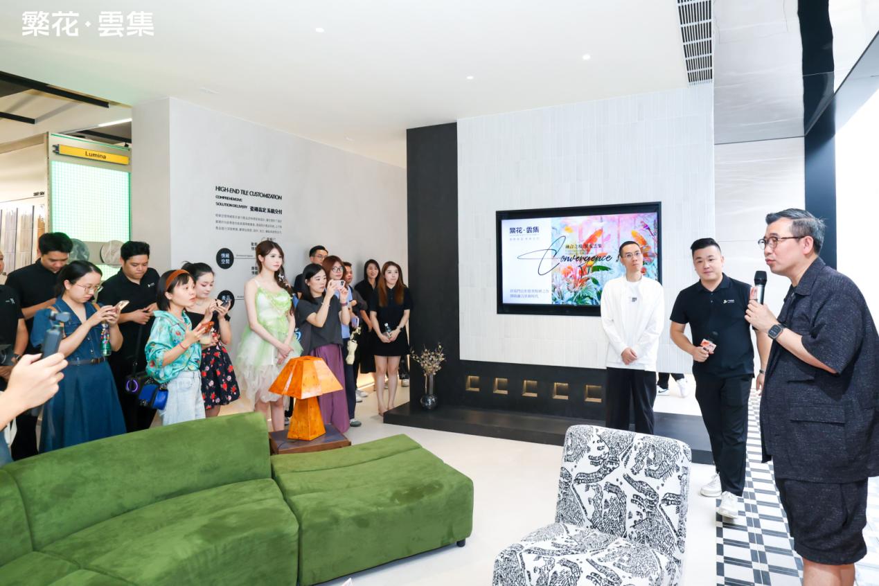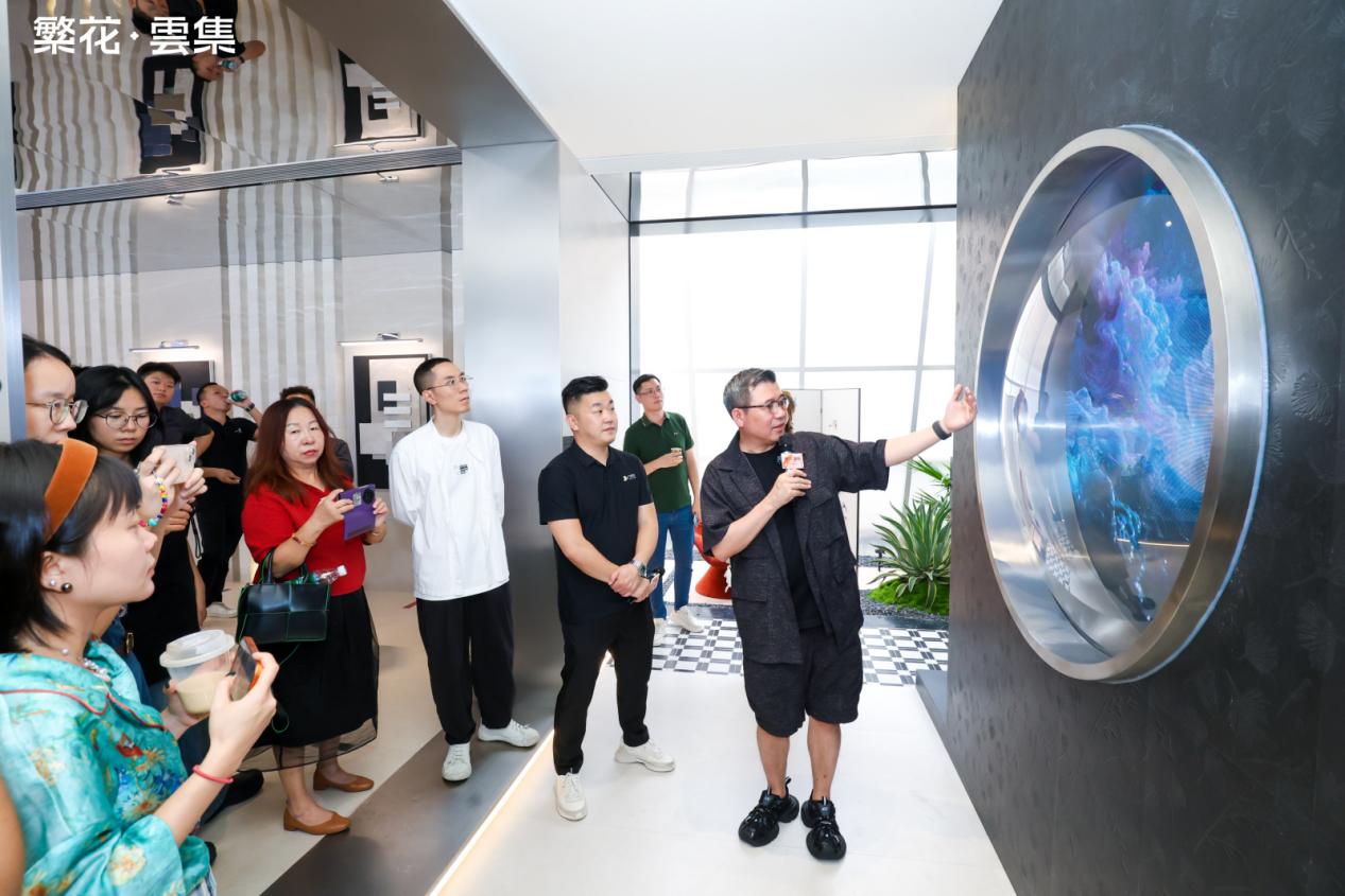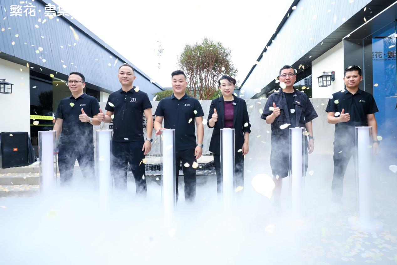 伴随着倒数声,佛山市繁花印象陶瓷有限公司总经理&「繁花·雲集」主理人 伍尚志先生、ID瓷砖 主理人 申志远先生、繁花艺术砖 主理人焦秋荣 先生、繁花艺术砖 销售副总经理严剑城 先生、佛山中陶城集团副总裁—汤洁明女主、瑞坤国际·正方良行设计首席设计师—徐庆良先生共同按下启动按钮,升腾的水雾象征着品牌美学的延展,绽放的繁花代表着「繁花·雲集」的美学宇宙正式开启。