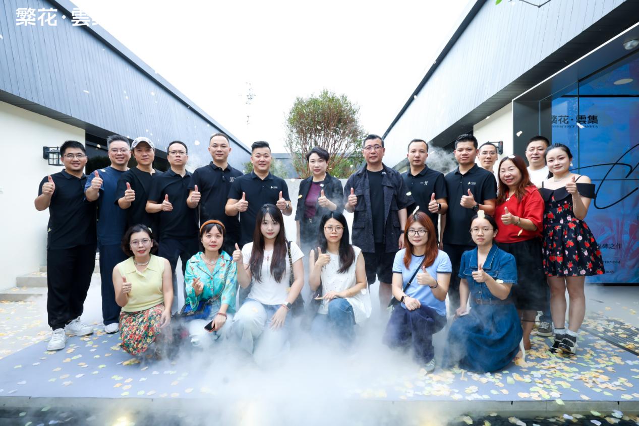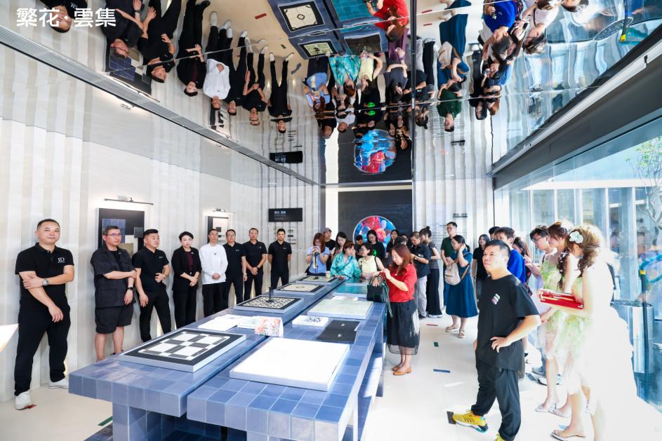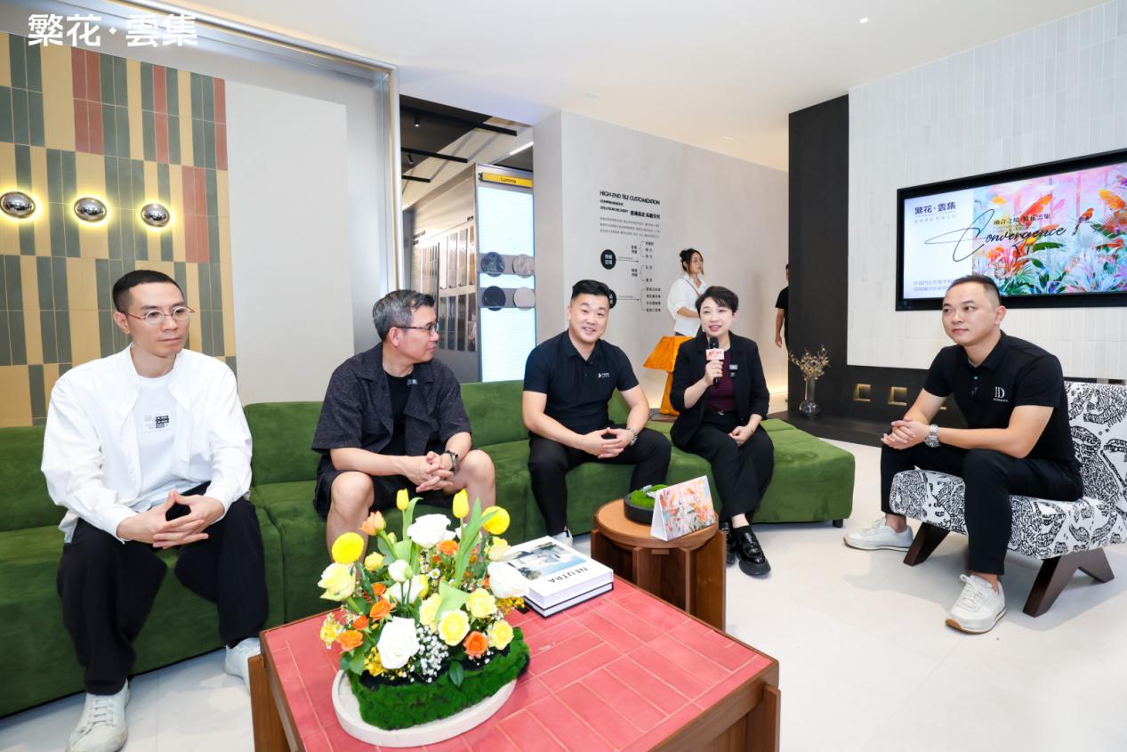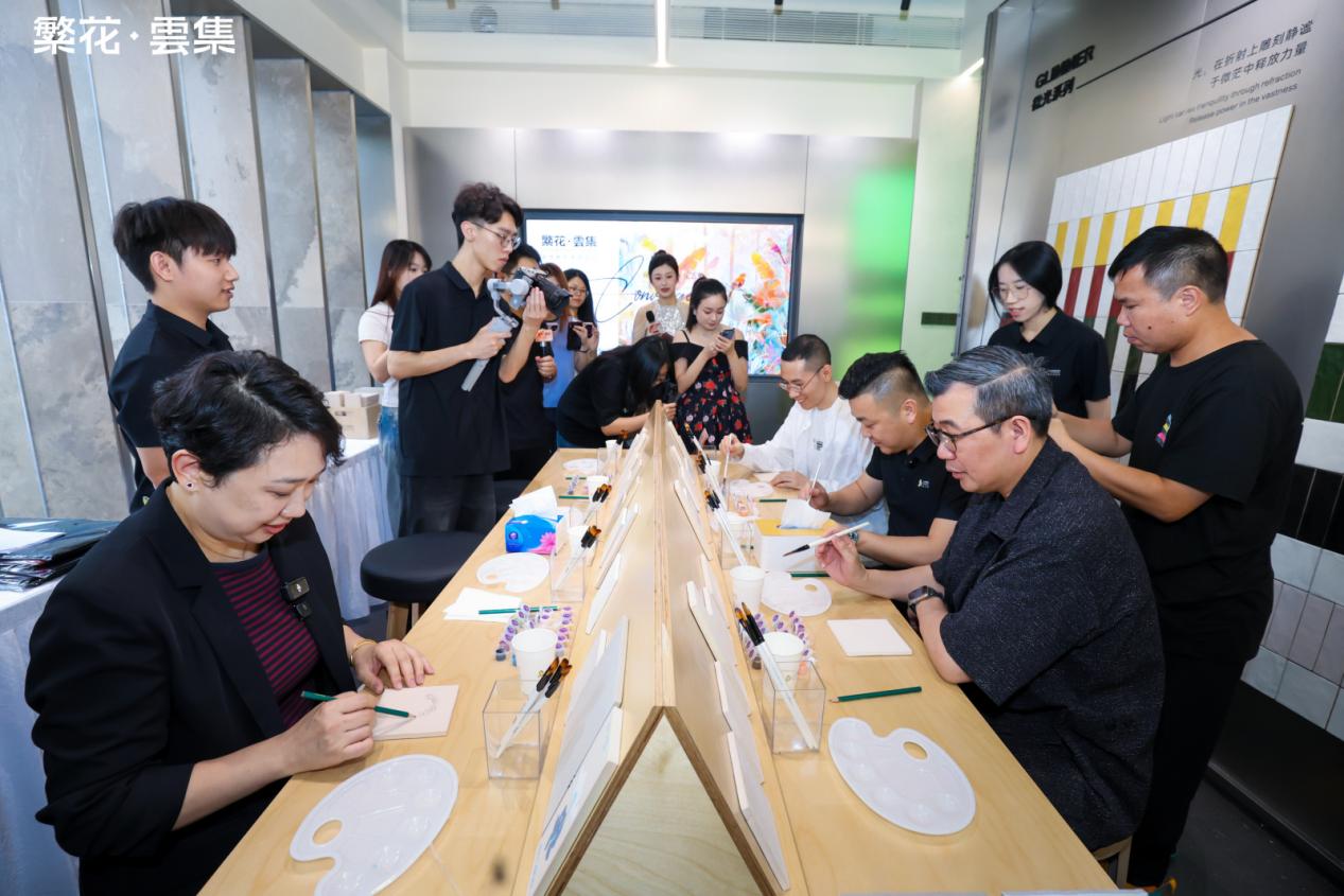 伴随着倒数声,佛山市繁花印象陶瓷有限公司总经理&「繁花·雲集」主理人 伍尚志先生、ID瓷砖 主理人 申志远先生、繁花艺术砖 主理人焦秋荣 先生、繁花艺术砖 销售副总经理严剑城 先生、佛山中陶城集团副总裁—汤洁明女主、瑞坤国际·正方良行设计首席设计师—徐庆良先生共同按下启动按钮,升腾的水雾象征着品牌美学的延展,绽放的繁花代表着「繁花·雲集」的美学宇宙正式开启。