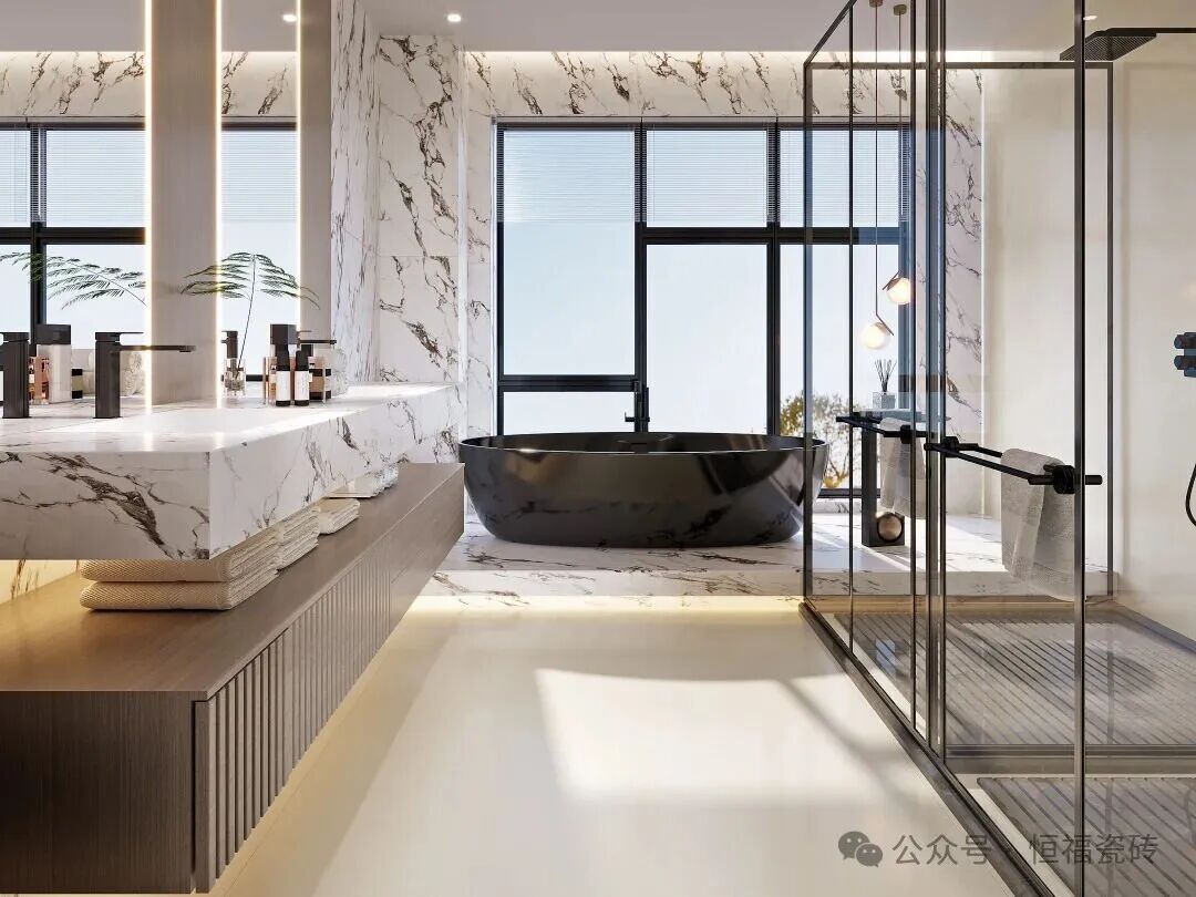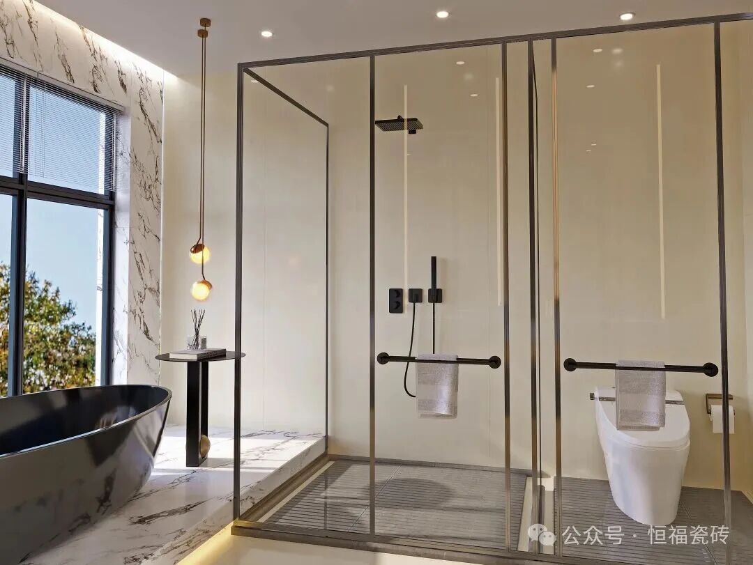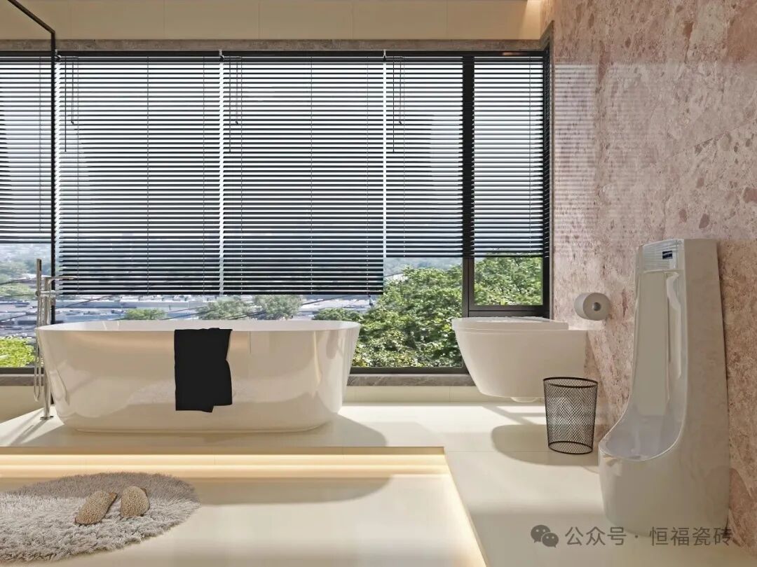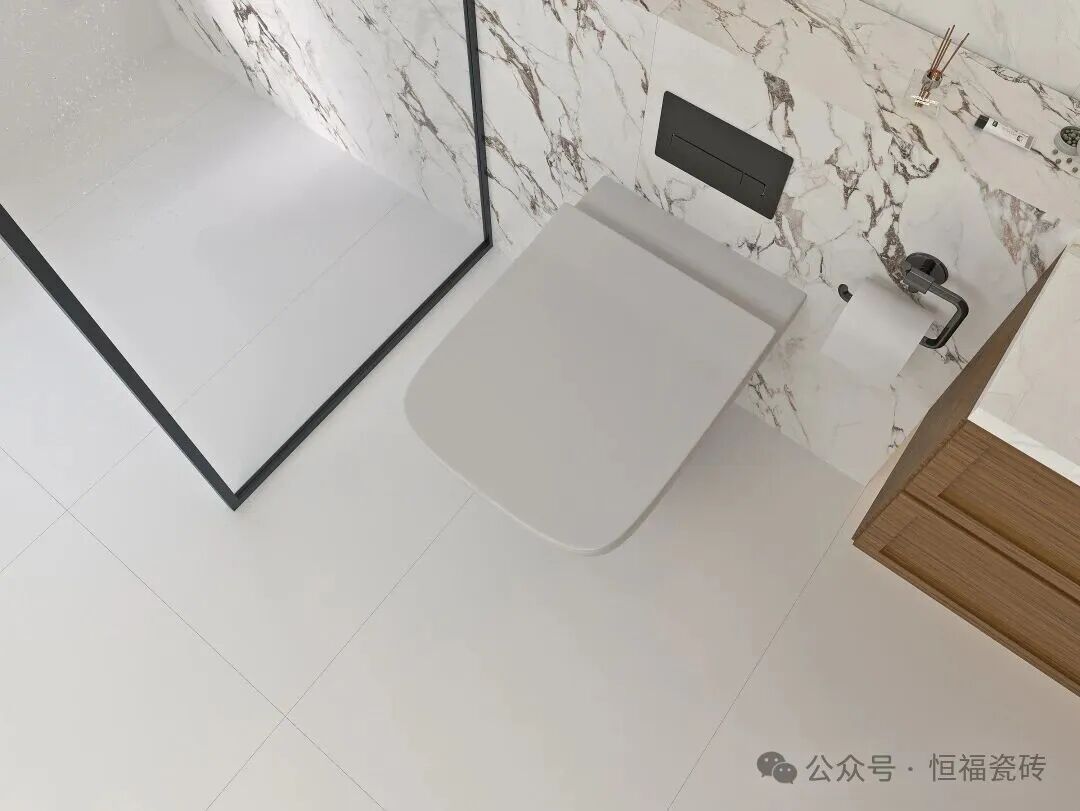 Tips:卫生间通铺建议选 600×1200mm规格,墙面2片到顶,搭配同色美缝剂,减少缝隙更显整洁哦。