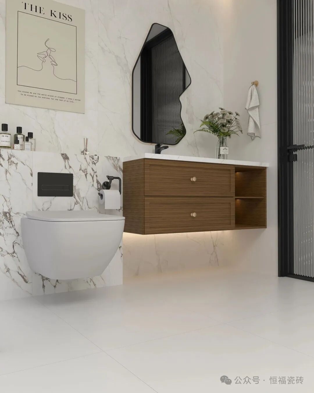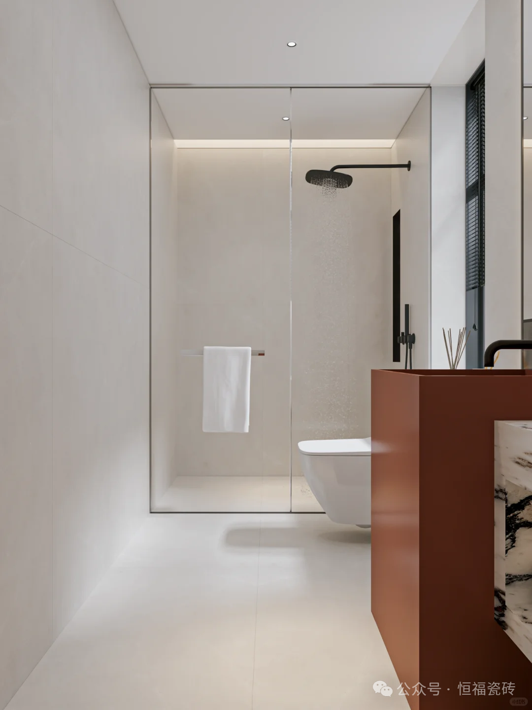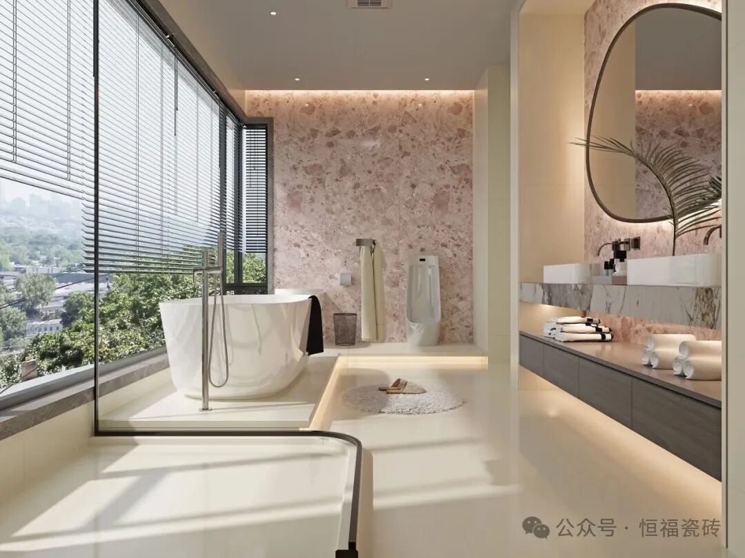 Tips:卫生间通铺建议选 600×1200mm规格,墙面2片到顶,搭配同色美缝剂,减少缝隙更显整洁哦。