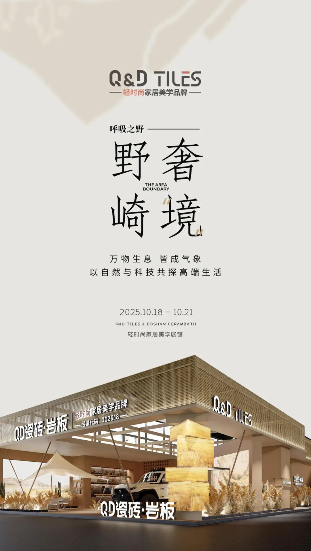 万物生息,皆成气象。QD瓷砖轻时尚家居美学展馆以“野奢·崎境”为主题,通过沉浸式空间表达,将自然美学的生命力与品牌的极致创造力交融,编织成一场跨越材质与自然界限的探秘之旅。