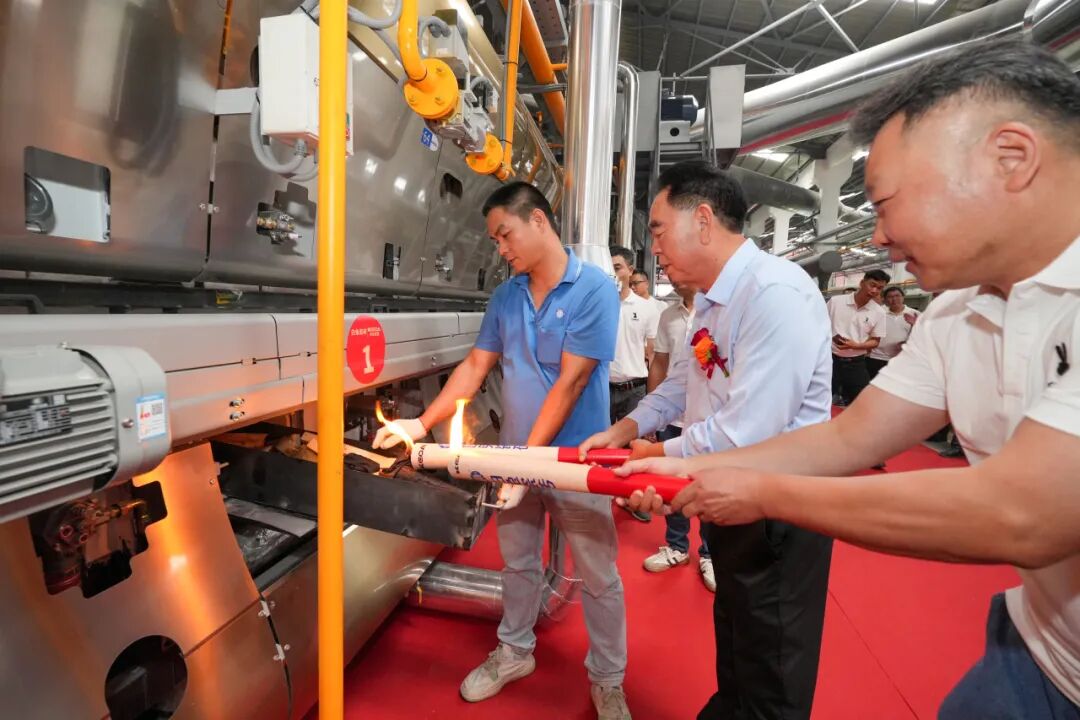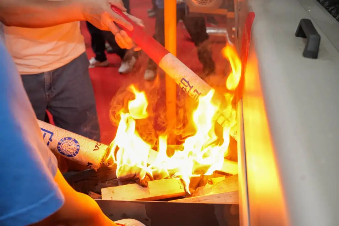 随后,迎来激动人心的时刻。在全场嘉宾与来宾的瞩目下,旭日集团董事长黄英明,旭日集团总经理宁红军,旭日集团执行总经理、集团总厂厂长范怀瑞,科达制造股份有限公司销售总监裴树元,科达制造股份有限公司中南销区总经理舒建雄,佛山希望数码印刷设备有限公司销售部经理刘锦文,旭日集团执行常务副总经理、集团销售运营中心总经理梁振东,旭日集团副总经理、集团总厂常务副厂长刘科琼,旭日集团副总经理、白兔瓷砖华东公司董事长黄芝霖,旭日集团副总经理、集团设备部部长谢添,旭日集团副总经理兼任珠海市白兔陶瓷有限公司总经理、白兔二厂厂长龚晖,旭日集团副总经理、兼任集团墙地砖研发中心主任吴志坚,旭日集团副总经理、集团生产销售库存总调委员会总执行、集团销售运营中心总经理助理冯伟,旭日集团总厂副厂长兼任白兔二厂副厂长陈祚华,旭日集团总厂副厂长、外墙砖马赛克文化墅砖研发中心主任操龙胜,旭日集团白兔二厂常务副厂长黄竞波,旭日集团白兔二厂副厂长李凯,旭日集团总厂瓷砖窑炉烧成技术总工王刚,旭日集团财务中心总经理李整如,旭日集团采购中心总经理唐青锋等领导手持点火炬,走向窑炉点火处。随着点火指令的发出,各位领导共同点燃火种,窑炉瞬间迸发出熊熊烈焰,象征着生产新程的澎湃启航;同时,鞭炮齐鸣,礼炮轰响,七色彩烟腾空而起,如虹贯日,将现场气氛推向高潮。