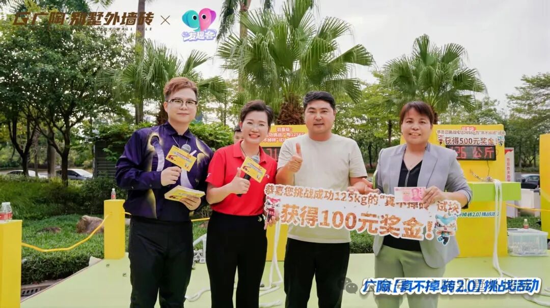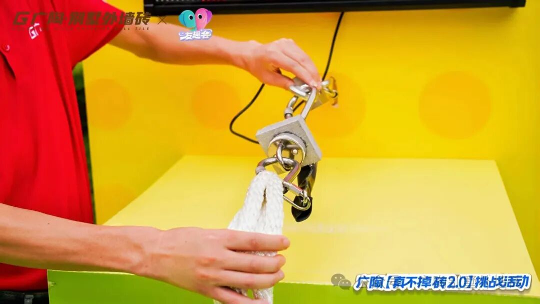 现场设置3组不同量级的拉力挑战装置,其中核心重磅的拉力试块,与吊车挑战所用的【广陶产品测试吊块】是完全一致的核心材质——模拟水泥墙+广陶超韧弹性瓷砖百粘胶+新国风五行1.0外墙砖。比赛时参与者两人一组,依次挑战进击不同量级,成功挑战者当场颁发对应奖励。活动时段分为三轮,每一轮都有主持人活力控场,组合搭档们默契协作、全力冲刺,全程氛围热烈。每一轮都非常精彩!