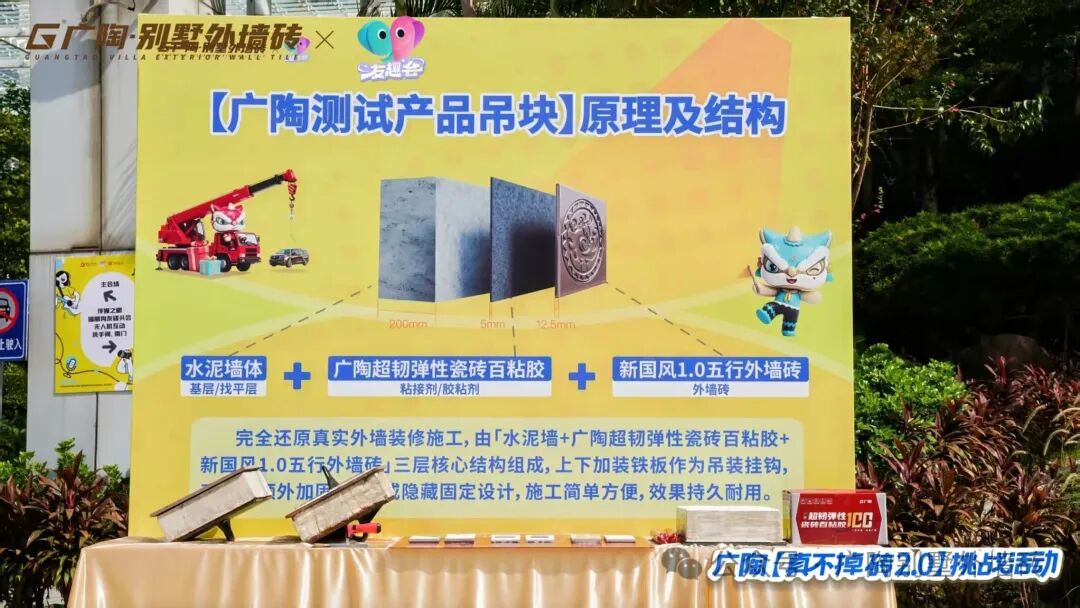 在追求外墙建筑美观与安全并重的今天,外墙砖脱落问题一直是行业的痛点!本次线上线下联动的“真不掉砖2.0”产品测试挑战活动,既彰显了广陶作为外墙砖领域领导者的责任担当与行业魄力,更以直观的现场测试实验,向业界同仁与广大消费者实力印证:广陶别墅外墙砖品质过硬、安全不脱落,辅材—广陶超韧弹性百粘胶粘结力强劲、稳固可靠,用实打实的测试结果筑牢产品口碑与市场信任。