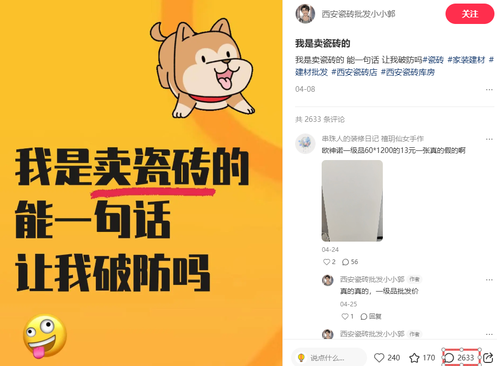 中陶君发现,这种由瓷砖经销商发布的笔记很能引引发热议——当然,绝大多数评论出自瓷砖商家,但素材明显是来源于他们日常的销售工作中——其中一则笔记居然收到了2000多条评论。