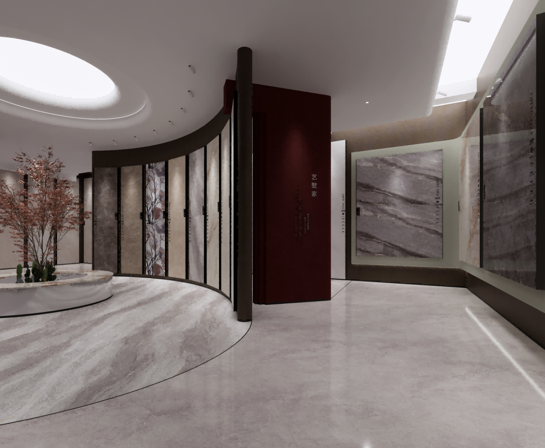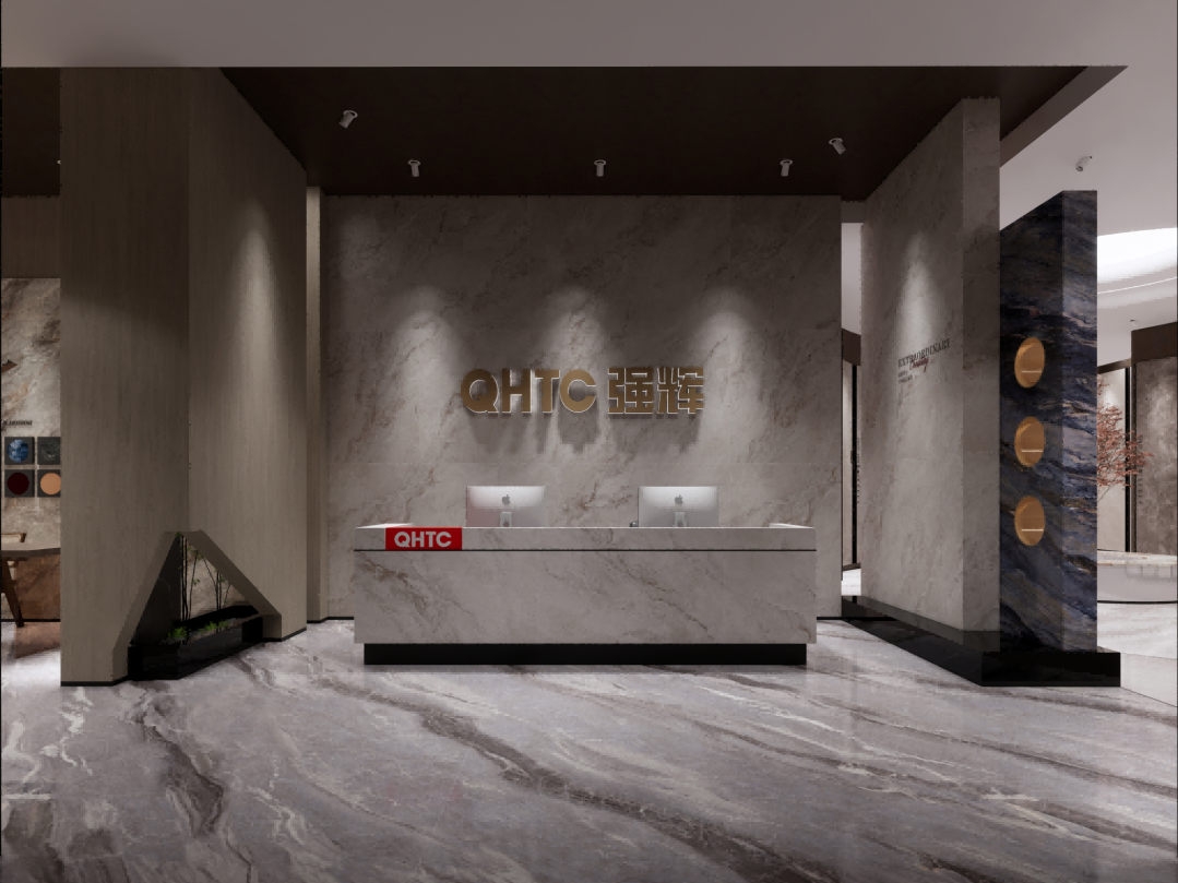 步入空间,映入眼帘的是强辉精工瓷砖金属质感的LOGO,在岩板背景墙衬托下熠熠生辉,地面纹理如自然脉络般舒展,营造出浑然天成的视觉韵律。
