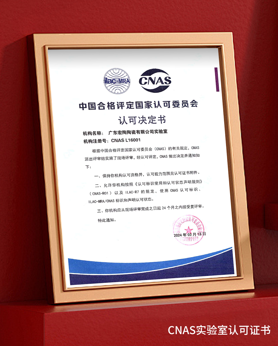 宏陶还依托国家CNAS认证实验室,系统化验证产品强度、耐磨、防滑、耐化学腐蚀等维度的性能。这一实验室认证体系为5A品质提供了科学支撑,持续推动着产品创新与技术迭代。