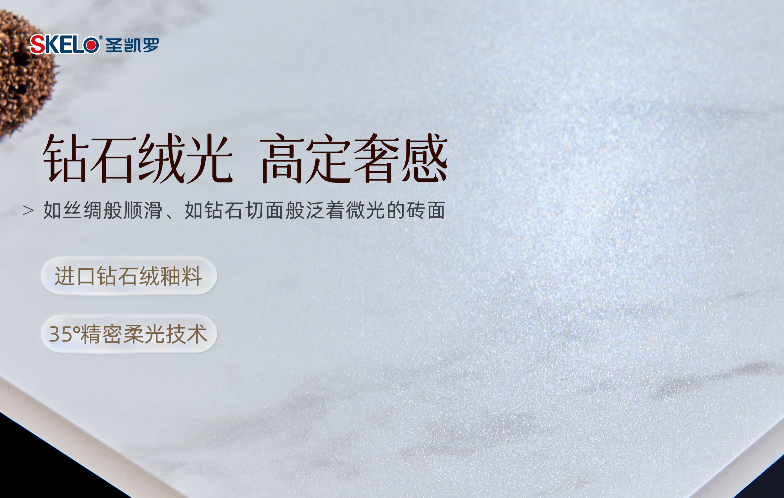 在35°精密柔光基础上,圣凯罗创新运用进口钻石绒釉料,淬炼出如丝绸般顺滑、如钻石切面般泛着微光的砖面。