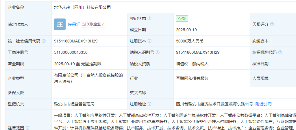 目前公开的资料显示,水华未来科技有限公司已于2025年9月19日成立,注册地位于四川省雅安市经济技术开发区滨河东路11号,主要从事人工智能应用软件开发、人工智能基础软件开发及人工智能公共数据平台建设等业务,并具备第一类及第二类增值电信业务经营许可,由帝欧水华全资控股。