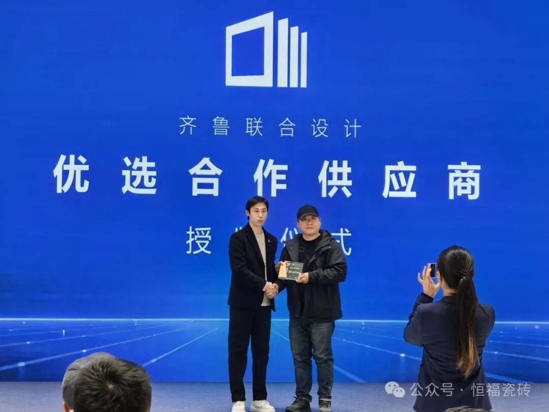 活动的高潮环节,在众多嘉宾的见证下,山东省室内设计行业协会会长哈图先生登台,正式授予恒福瓷砖“齐鲁联合设计优选合作供应商”荣誉牌匾,并完成签约仪式。