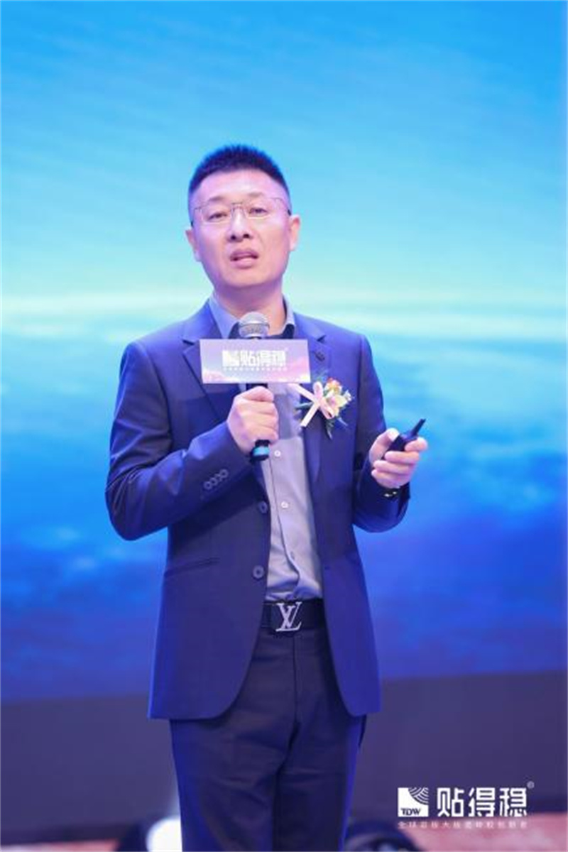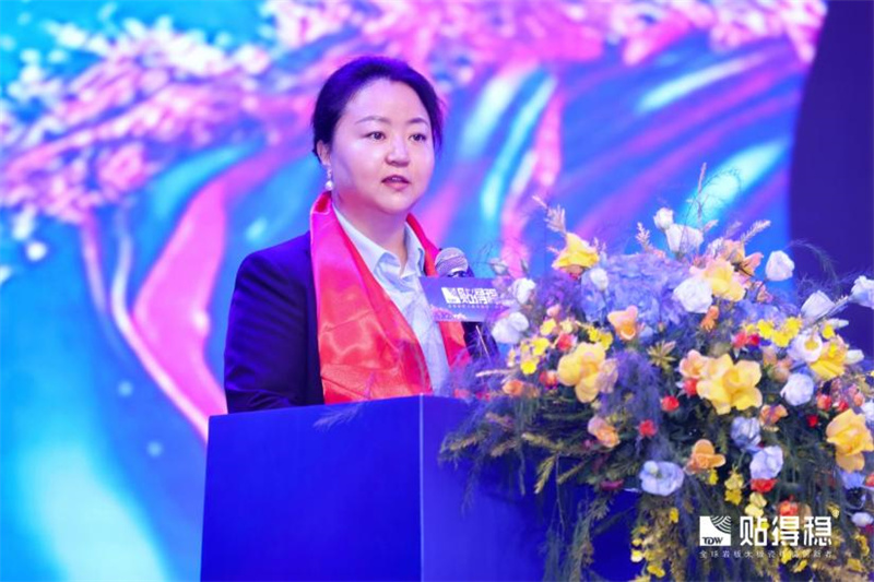 合睿企业投资集团董事会主席、贴得稳品牌创始人、贴得稳品牌首席执行官(CEO)胡媛女士率先发表致词。她深情回顾了贴得稳五载风雨征程:从初入行业时的探索前行,到逐步攻克岩板铺贴技术难题;从深耕国内市场,到逐步布局全球版图,每一步成长都离不开合作伙伴的信任与支持。胡总强调,面对行业周期波动,贴得稳始终以“品质”为根基、以“创新”为利刃,未来将持续加大研发投入,深化全球市场布局,以中国智造的匠心品质,为全球亿万家庭提供更优质的铺贴解决方案。