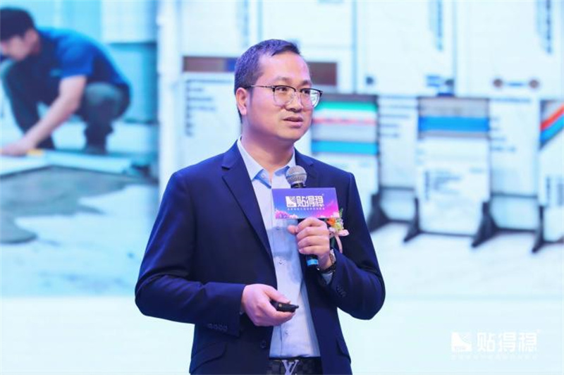 佛山市陶瓷行业协会会长尹虹博士则从行业趋势视角展开分享。他指出,当前建材行业正处于“存量竞争+创新突围”的关键阶段,贴得稳凭借对市场需求的敏锐洞察、对技术创新的执着追求,成功穿越行业周期,成为岩板大板瓷砖胶领域的领军品牌。他寄语贴得稳,未来需继续坚守“守正出新”的理念,在技术研发、服务升级上持续发力,为行业发展提供更多可借鉴的“贴得稳经验”。