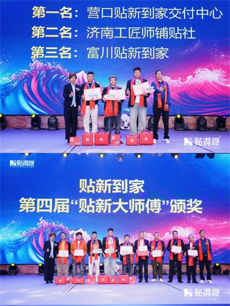 在“匠人荣誉”环节,贴新到家第四届“贴新大师傅”评选结果揭晓,他们凭借精湛的铺贴技艺、对细节的极致追求,成为行业工匠的典范。