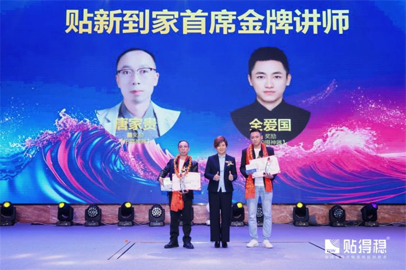 随后,贴新到家培训老师唐家贵先生、全爱国先生也荣获表彰首席金牌讲师,他们深耕培训领域,通过系统化教学,为行业培养了大批专业铺贴人才,用知识与经验赋能伙伴成长。