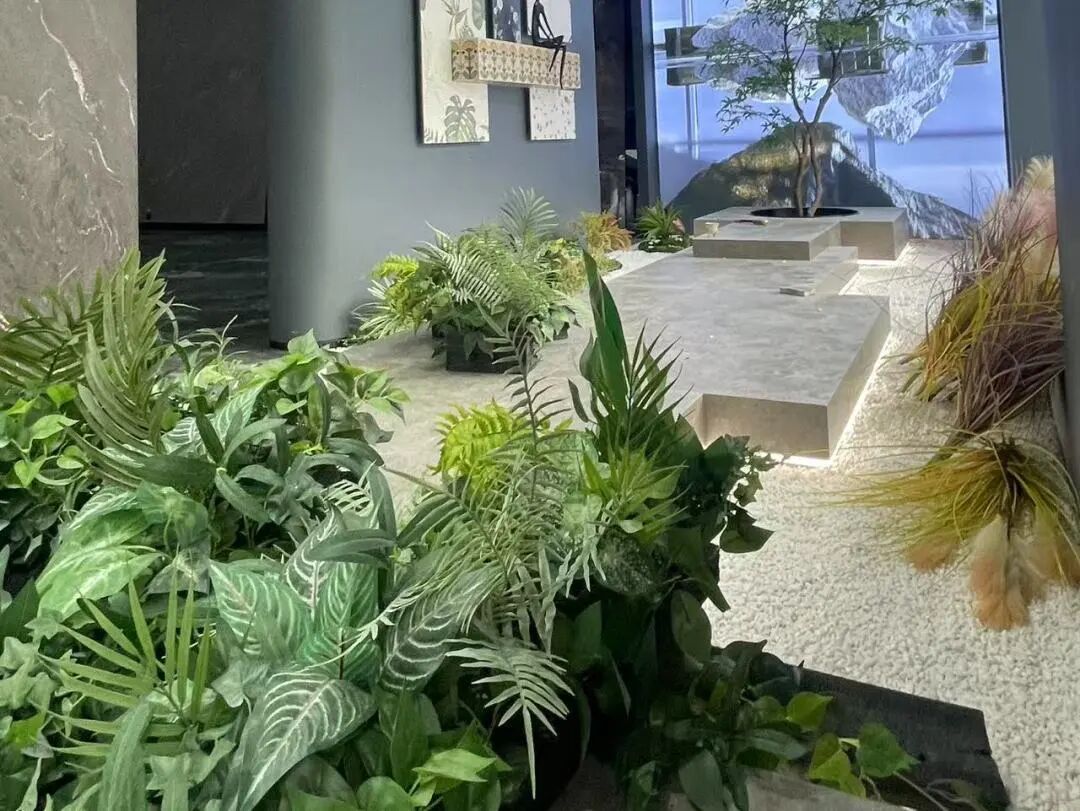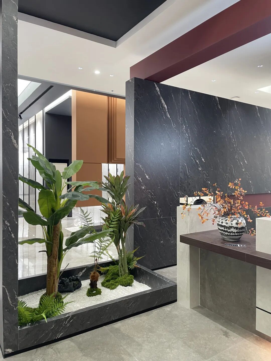 在动线设计中,延续了中式宅院“移步换景”的序列逻辑,运用“借景”、“造景”手法,串联光线、绿意与各种材质肌理。墙面的素石肌理、地面的延绵石纹,隐喻自然山水,与各种绿植相得益彰。