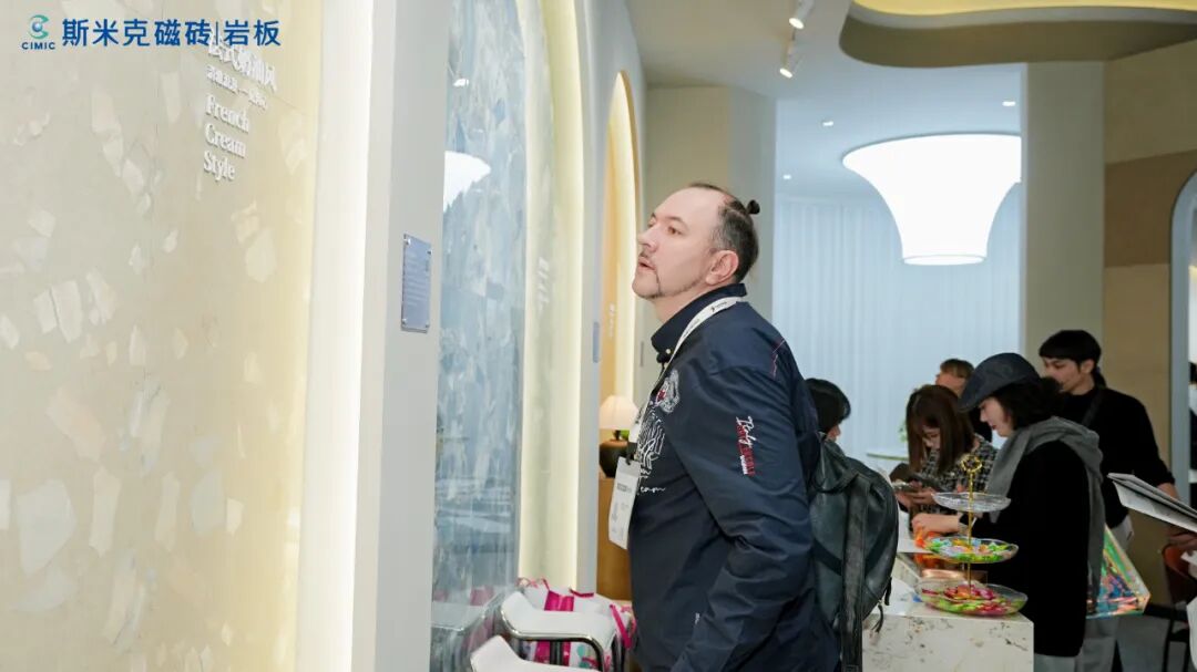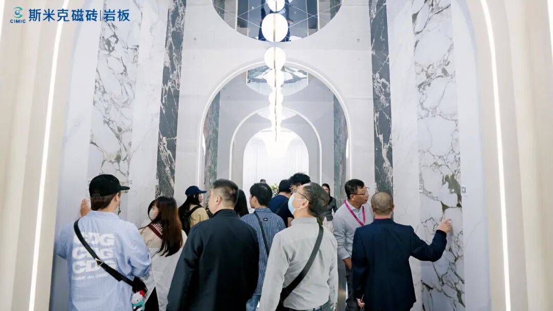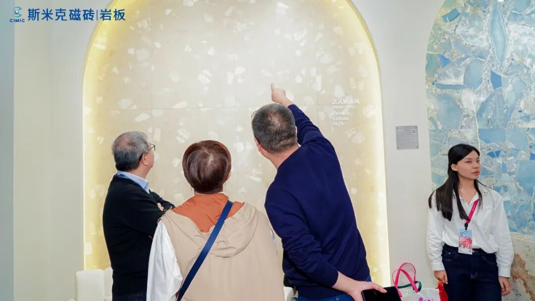 值得一提的是,展馆内外建筑墙面大面积应用的“莱姆石”,与斯米克三十多年来持续迭代的匠心之作“玻化石”两大经典产品同样备受观众青睐。