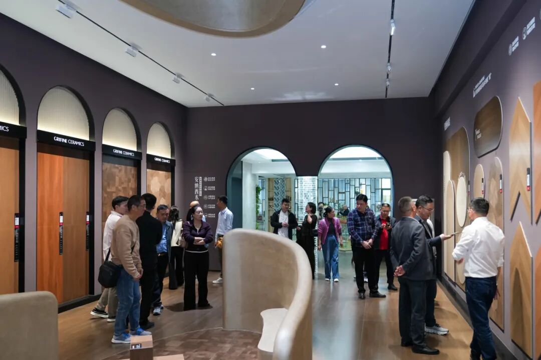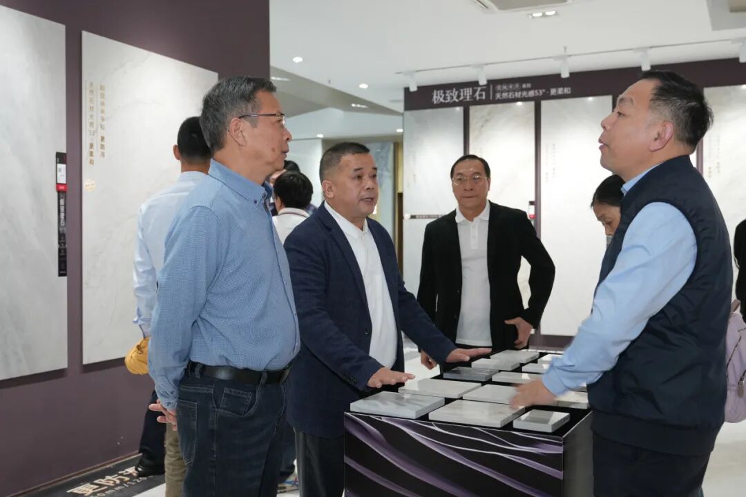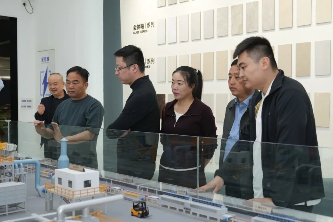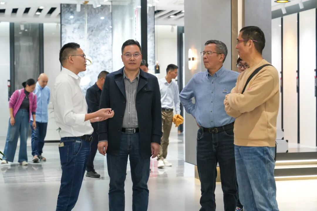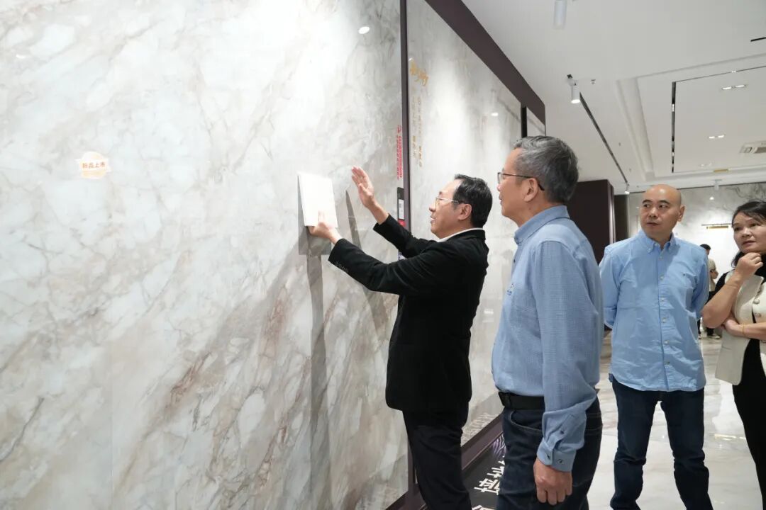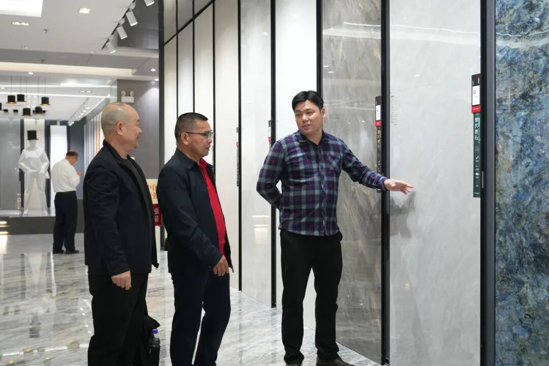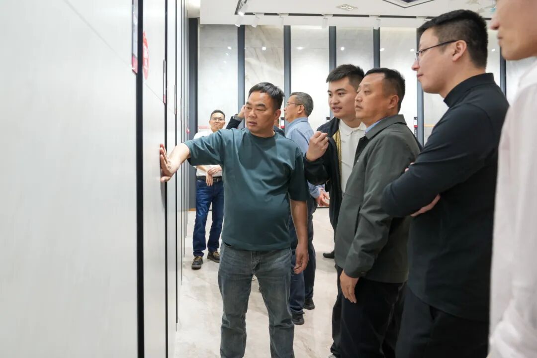 考察团在展厅详细了解了能强瓷砖产品体系,从逼真还原天然肌理的木纹砖,到融合七彩结晶工艺的彩晶大理石,再到具备超强防污性能的珍珠绒柔光砖。