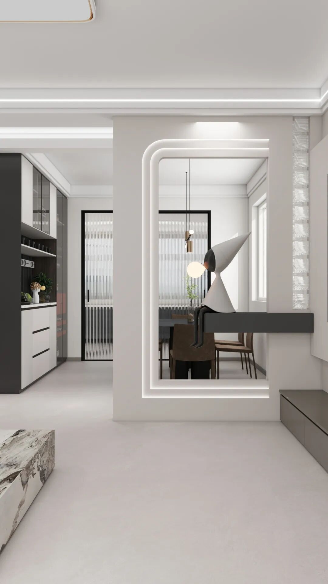 全屋地面选用浅灰色的“伊斯迪浅灰”通铺设计让客餐厅、过道等空间视觉上更连贯开阔,适配现代简约的轻盈氛围。