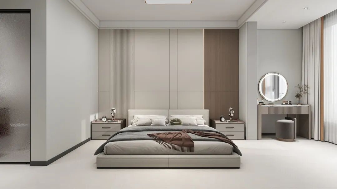 卧室以 “舒适温馨” 为核心,地面选用暖米白色调,光线柔和不刺眼,暖色调自带温润感,为卧室注入自然暖意。