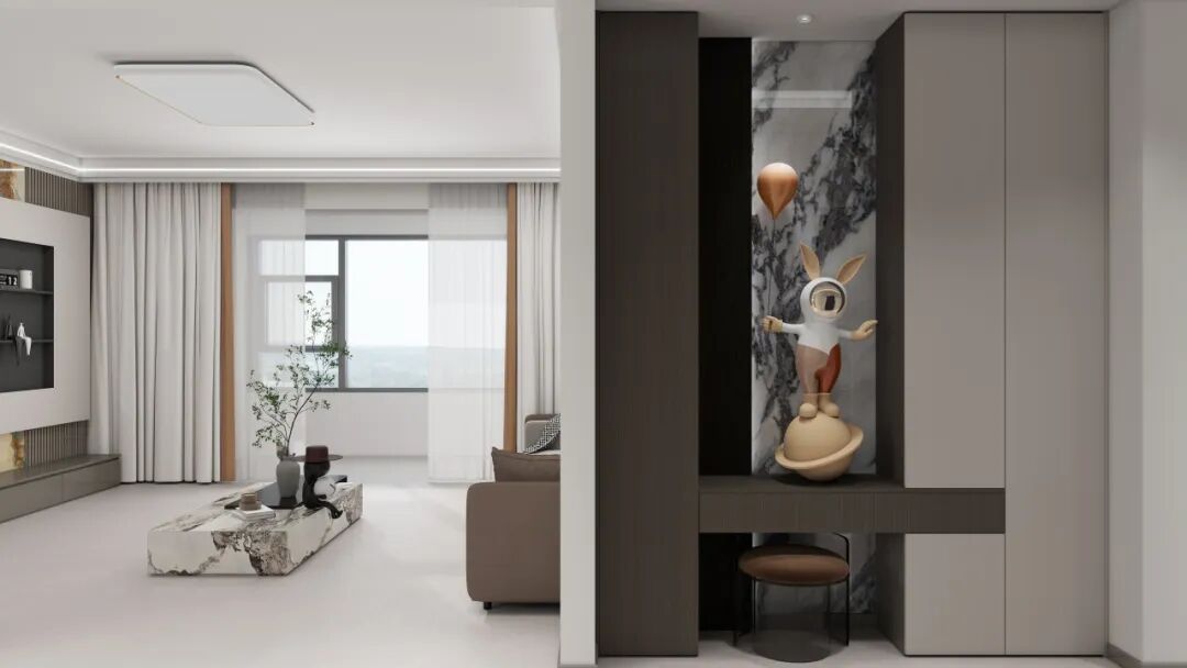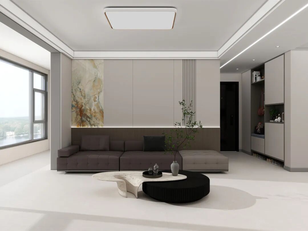 浅米白色调铺陈全屋地面,低饱和的底色 + 细腻的肌理,像一层柔和滤镜包裹空间,既拉伸了视觉尺度,又与浅调墙面、柔感沙发形成呼应,让整体氛围自带轻盈柔和的气质。