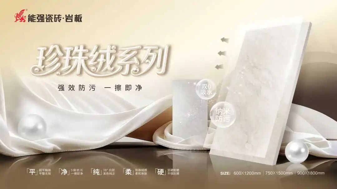 「珍珠绒」柔光砖系列,以高平整、超耐污、更耐磨的优势解决行业柔光砖痛点,既满高级的装饰效果,又满足生活实用功能。