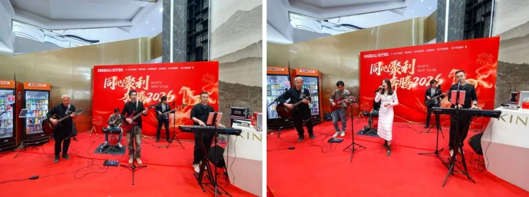 夜幕降临,“同心聚利·奔腾2026”主题晚宴开启。企业董事与员工举杯共饮,乐队深情演绎经典曲目助庆盛典。