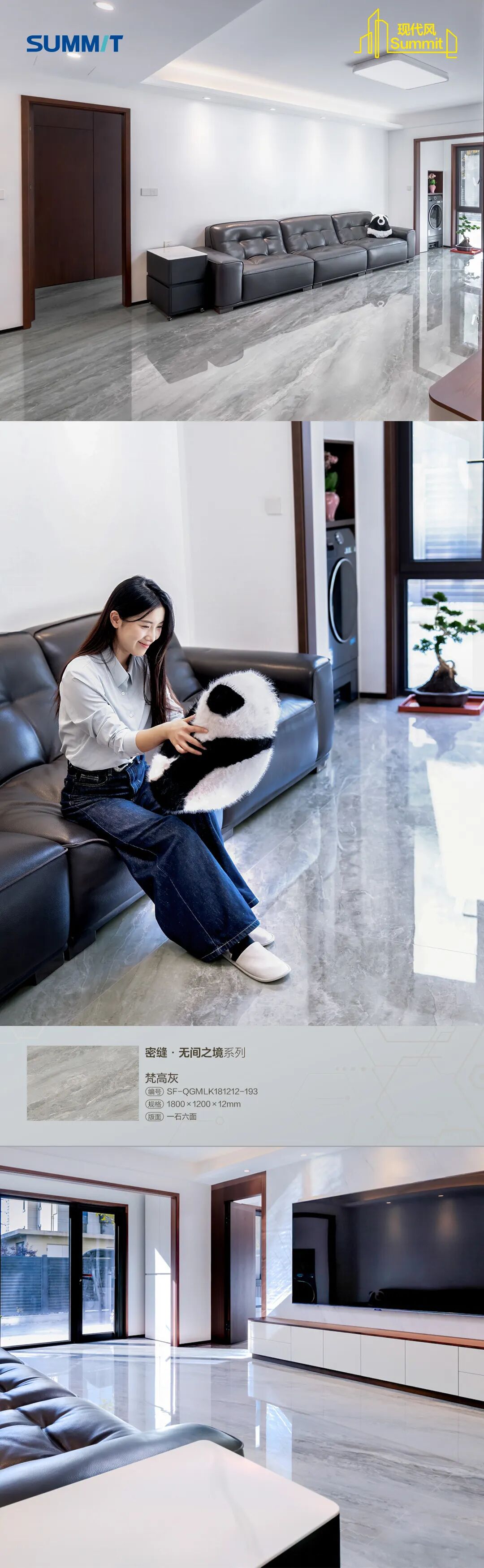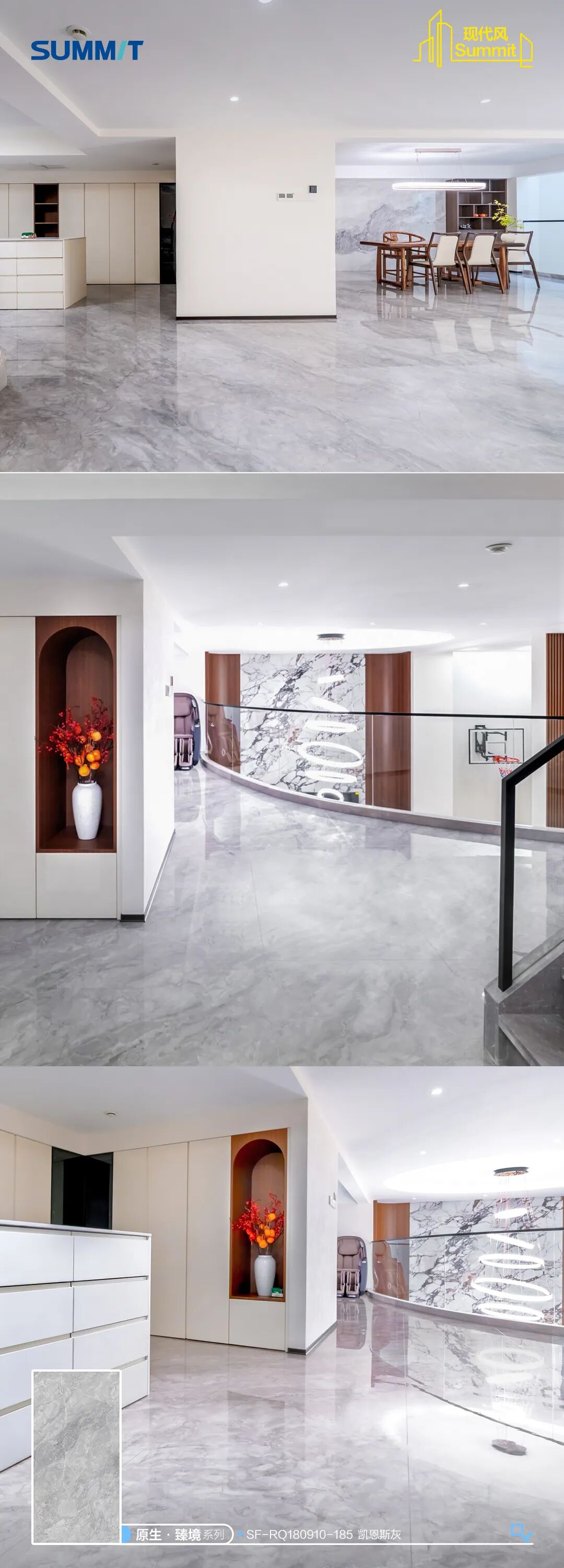 走进挑空客厅,首先感受到的是一种高级而舒适的氛围。整个一层公共区域选用萨米特「密缝·无间之境」系列,1.8×1.2米的大规格瓷砖以3:2的黄金视觉比例铺陈,缝隙几乎不可见,形成如一整片石材般的完整效果。