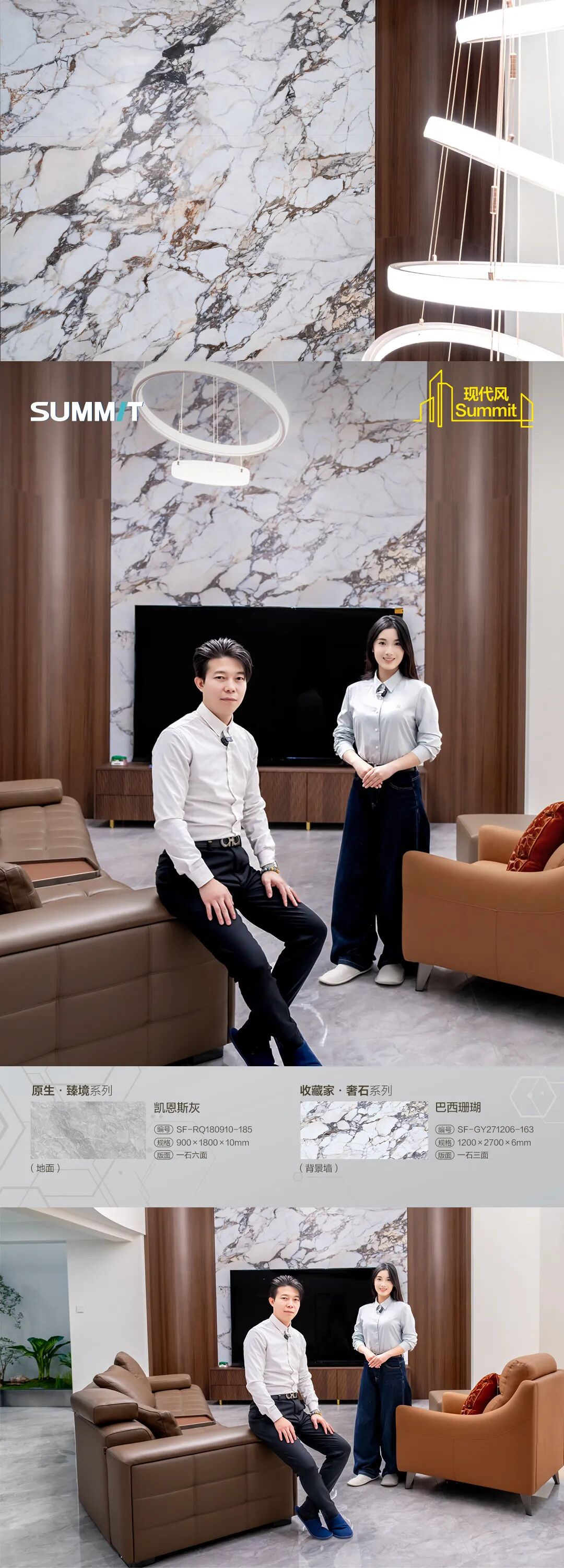 在构建沉稳基底后,设计需要一处视觉“高潮”。横跨两层的景观墙选择了萨米特收藏家系列,采用立体精雕模具工艺,完整复刻天然石材脉络,一次铺贴成型。