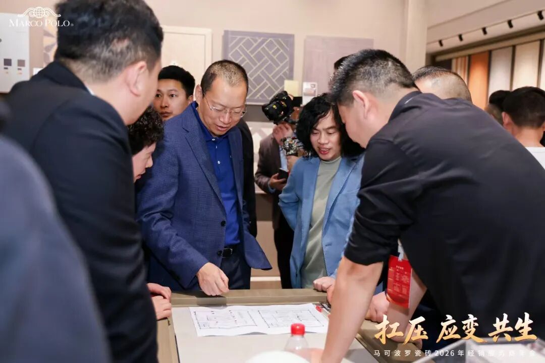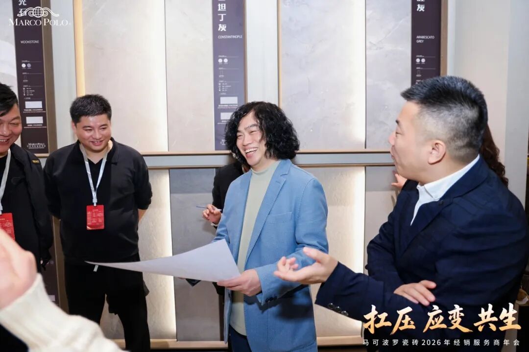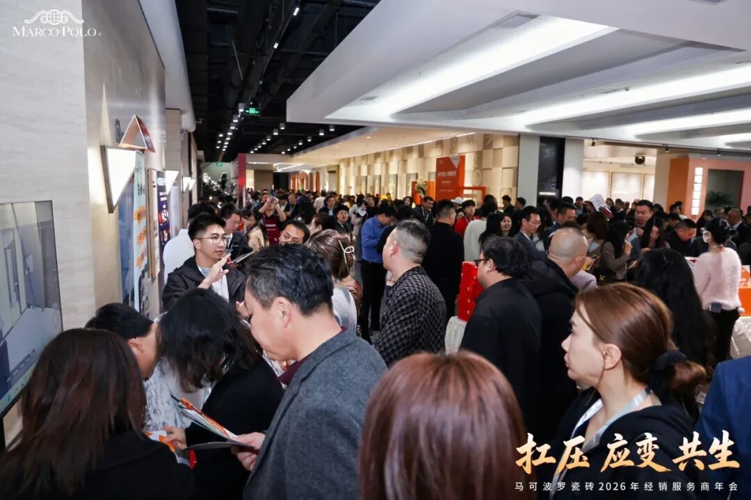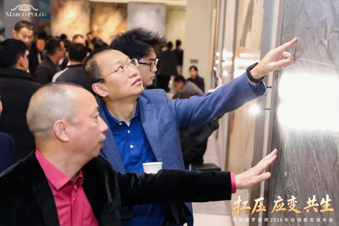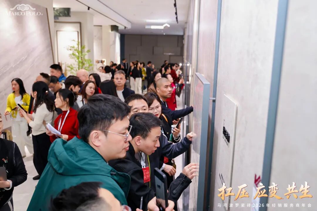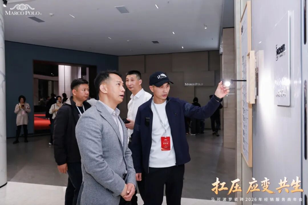 年会期间来自全国各地的马可波罗瓷砖经销服务商走进总部展厅,一同品鉴马可波罗2026新品风采。