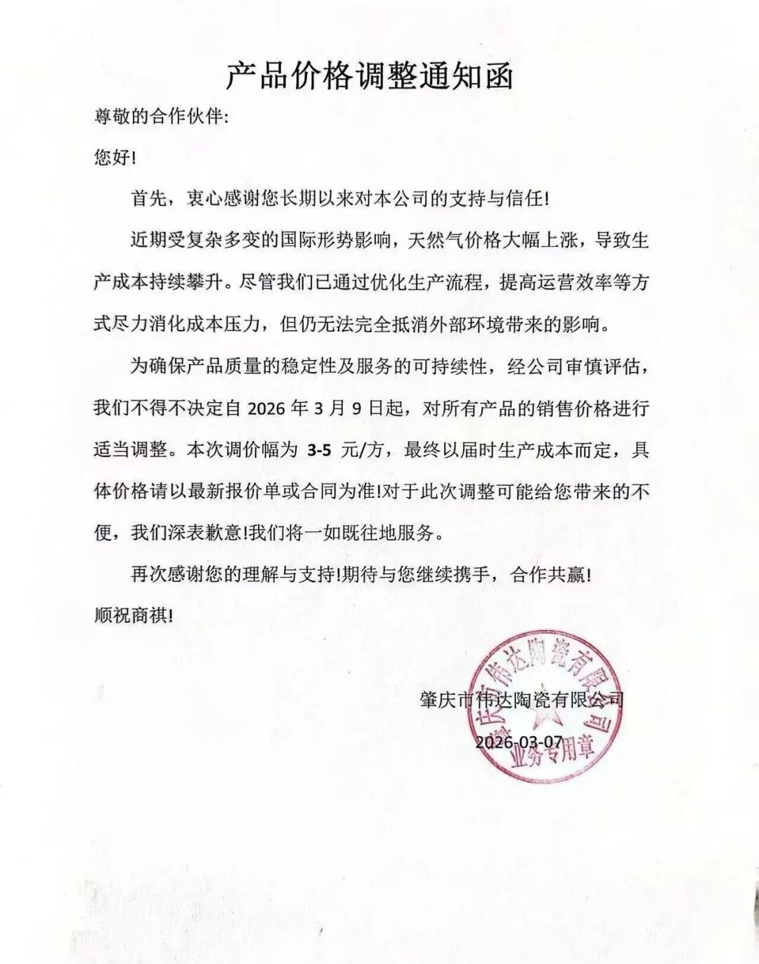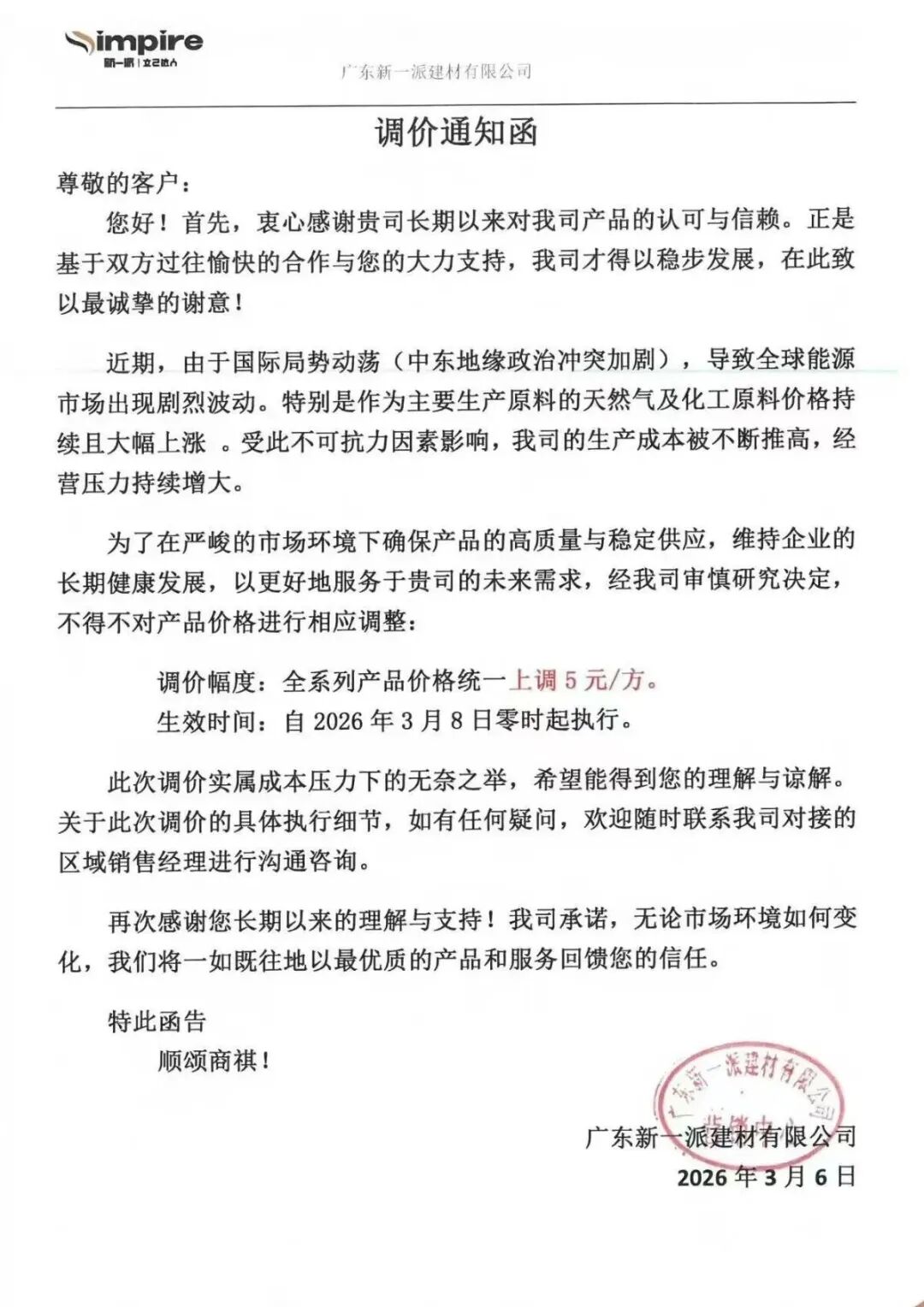 近期,新一派建材、伟达陶瓷、广东中岩、众岩联、大板智联等广东陶企相继发布涨价通知,因受复杂多变的国际形势影响,天然气价格大幅上涨,导致生产成本持续攀升,调价幅度约为3—5元/㎡,最早执行时间为3月8日。