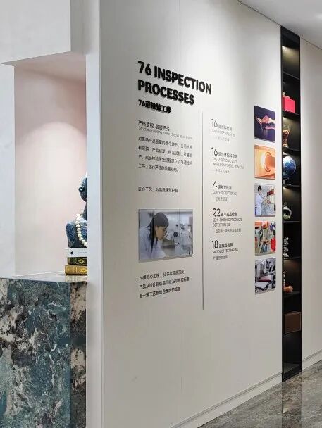 地面同色通铺,打破黑色的沉闷,以通透亮光和大气连纹,营造开阔视野。品牌历程墙设于拐角楼梯处,拾级而上,品牌故事随之徐徐展开,完成一场沉浸式的品牌叙事。