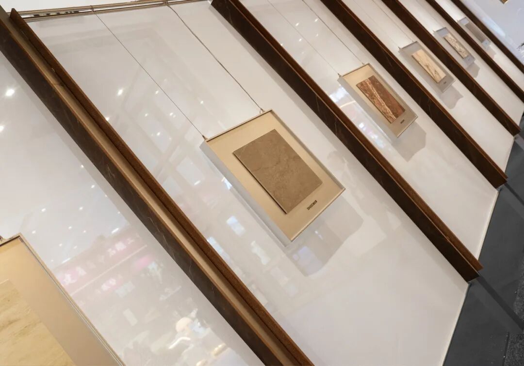 品牌将展位设计为“艺术馆”而非“材料馆”,动线从艺术画廊过渡到大板展区,再经由中央洽谈区的岩板定制长桌、壁炉、情绪板等元素,营造出沉浸式体验,最终落位于视觉无限延展材质观赏区,完成了一次岩板美学的四重奏演绎。