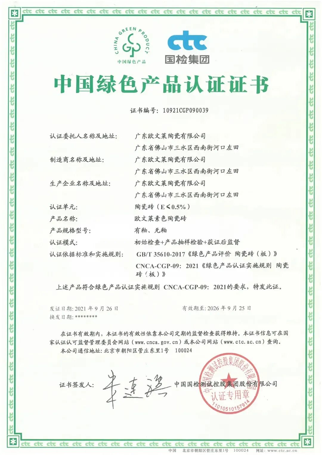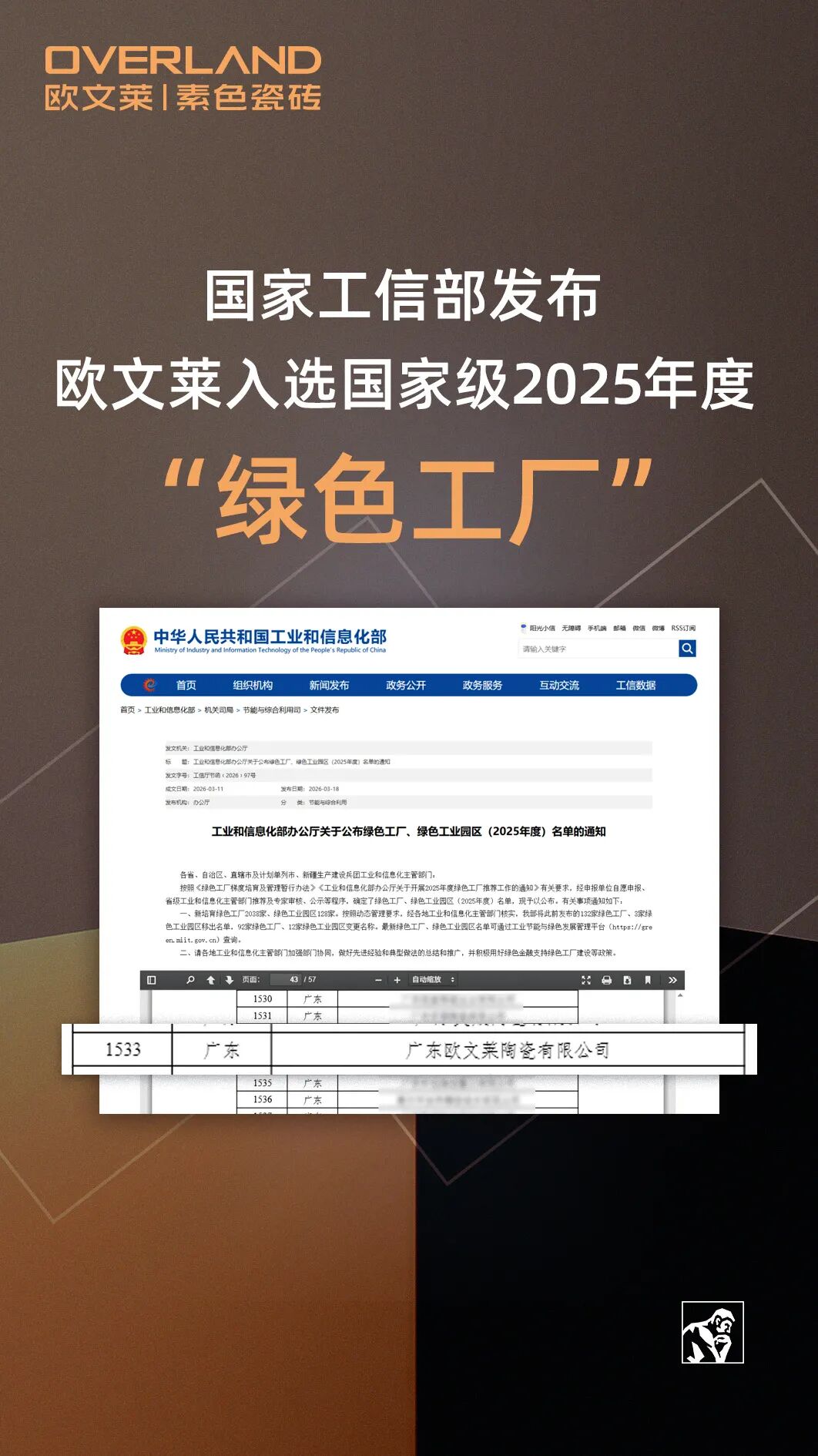 2025年度“绿色工厂、绿色工业园区”名单。本次共认定绿色工厂2038家、绿色工业园区128家。凭借在绿色生产、智造升级及创新体系建设等方面的卓越表现,广东欧文莱陶瓷有限公司成功入选这一国家级“绿色工厂”榜单。