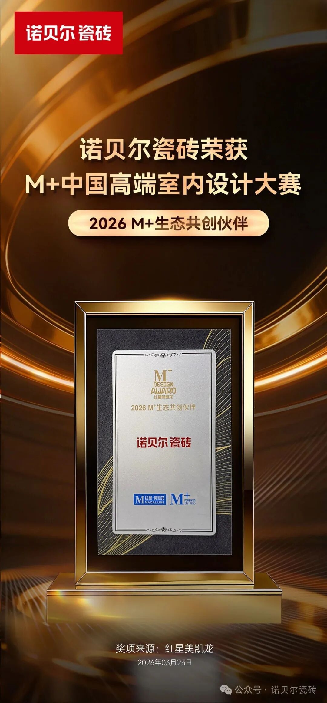 3月23日,红星美凯龙M+中国高端室内设计大赛2025颁奖礼在上海圆满落幕。作为本次行业盛典的核心荣誉之一,“2026 M+生态共创伙伴”称号正式揭晓,诺贝尔瓷砖凭借深厚的品牌底蕴、卓越的产品创新能力、完善的服务体系,以及在高端建材领域与设计生态融合的突出实践,成功斩获该殊荣。这一奖项不仅是红星美凯龙对诺贝尔瓷砖品牌实力与行业影响力的高度认可,更是双方携手深耕家居设计生态、共筑美好家居生活的重要契机,标志着诺贝尔瓷砖正式成为红星美凯龙M+设计生态的核心共创伙伴,将与红星美凯龙一道,推动家居设计与高端建材的深度融合,赋能行业高质量发展。