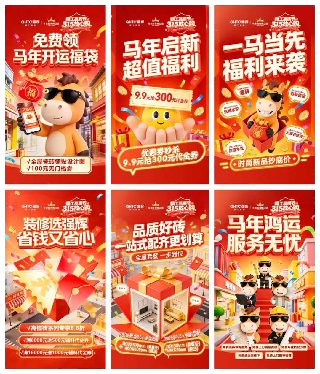 驭马争先,开门红耀。为赢战2026开门红,强辉总部精英携手全国强辉门店全力出击,制定一系列宣传活动,包括店面氛围布置、店面员工培训、小区业主邀约、超值代金券钜惠放送,多维度布局全方位发力,满满诚意,开启马年家装焕新征程!