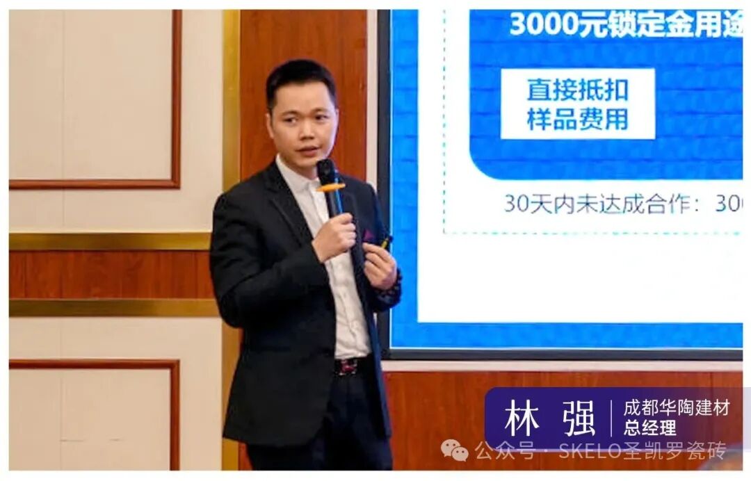 成都华陶建材总经理林强现场发布圣凯罗瓷砖招商专属政策,重点解读区域锁定、样品补贴、三仓增值、星火计划等核心扶持,满满诚意赢得现场广泛认可: