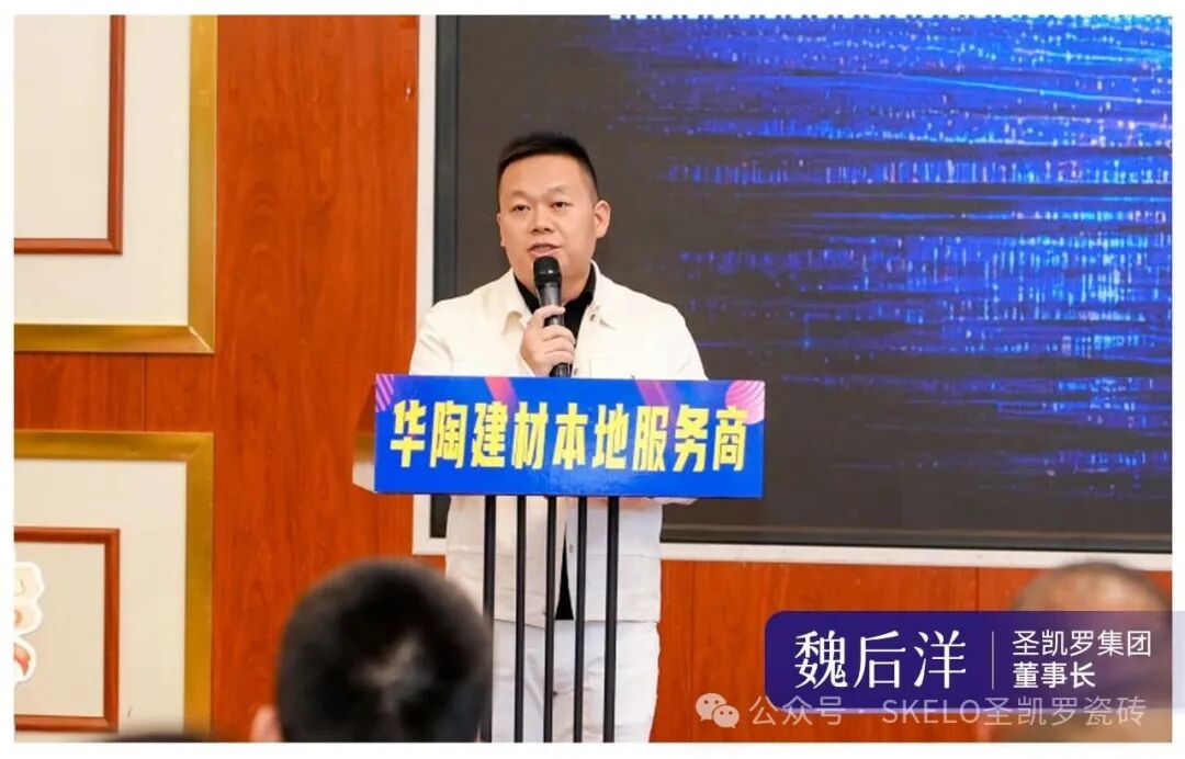 随后,圣凯罗集团董事长魏后洋发表致辞。魏后洋董事长指出,当前瓷砖行业已进入存量竞争与数字化转型的关键期,低价内卷不可持续,唯有好产品、真流量、强赋能才能穿越周期。