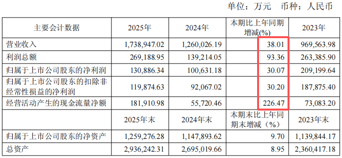 2025年,科达制造实现营收173.89亿元元,同比增长38.01%,其中,海外收入116.97亿元,同比增长45.84%,占比超67%;净利润21.67亿元,同比增长68.17%;归属于上市公司的净利润13.09亿元,同比增长30.07%;经营活动产生的现金流量净额18.19亿元,同比增长226.47%。