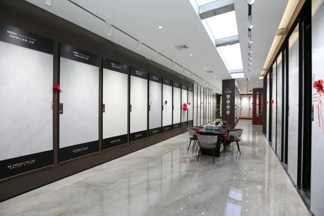 新锦成融合店则走的是“多品牌矩阵整合”路线。其旗下汇聚新岩素、兴辉、加西亚等多个核心品牌,形成覆盖不同价格区间、风格和用途的全阶产品矩阵。通过50多条智能化生产线+70多亿元的年产值,其产品可涵盖岩板、陶瓷大板、大理石瓷砖、仿古砖等品类,花色超1200个。该模式以“装企第一合作伙伴”为定位,为装企提供一站式选品、定制化方案设计、标准化售后等全链路服务支持,将经销商从单一品牌专卖店中解放出来。