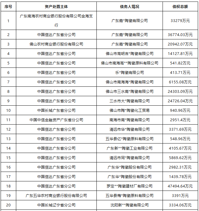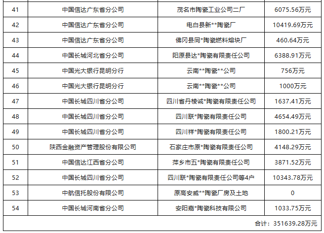另一方面,随着越来越多的陶企陷入债务泥潭,高额债权风险正加速暴露——仅阿里拍卖平台上的54笔债权招商就涉及47家陶企、总额超35亿元,其中不乏单笔近5亿元的巨额坏账,且多数债权早在2025年甚至更早就已开始招商,至今未能妥善处置,反映出债务链条的复杂性和清偿压力的长期性。