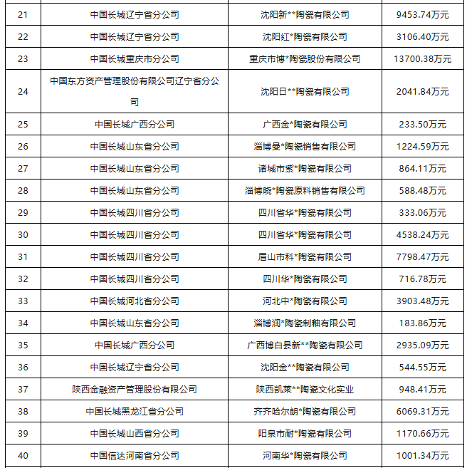 山东联*陶瓷有限公司债权成功转让,债权总额1556.95万元,抵押物为宗地、房屋建筑等不动产;沈阳浩*陶瓷有限公司、沈阳金**陶瓷有限公司债权已线下处置,抵押物包括住宅、工业地产及其他,债权总额1.36亿元;沈阳浩*陶瓷有限公司等2户债权或债权收益权成功拍出,债权总额9240.80万元,成交价5050万元;安阳市中*陶瓷有限公司等2户债权资产以1205万元的价格成交。