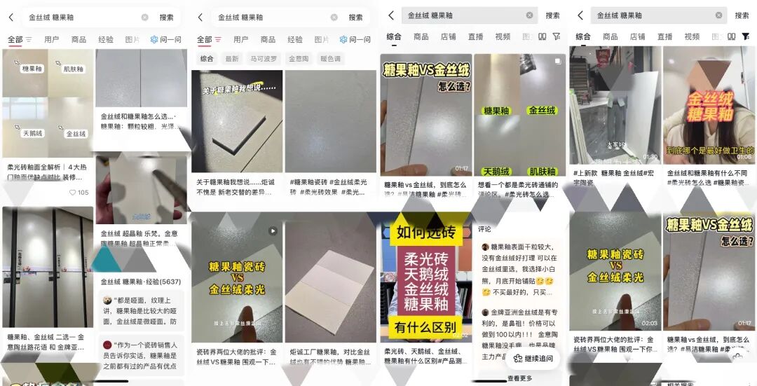 简单来说,金丝绒追求的是“丝滑如绸”的极致触感,糖果釉追求的是“亮晶晶甜蜜蜜”的视觉冲击。两种瓷砖各有千秋,也各有拥趸。从用户视角来看,不同消费者对于金丝绒和糖果釉的关注点呈现出明显的差异。