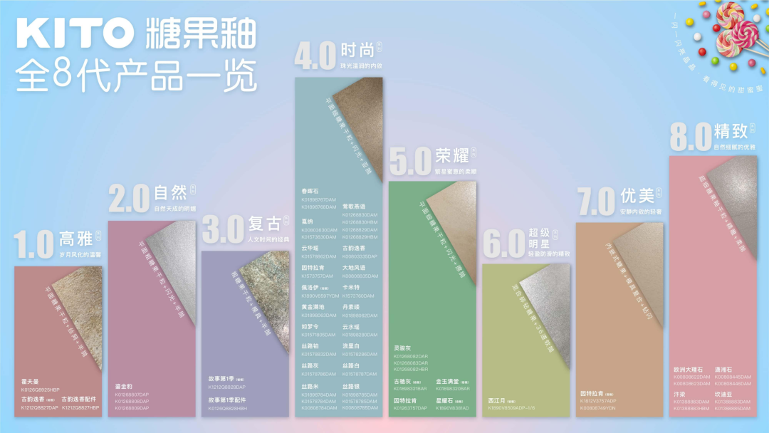 自2013年与全球色釉料巨头西班牙陶丽西合作引入糖果釉技术以来,金意陶便开启了糖果釉本土化研发之路。2014年实现首款产品量产上市,成为国内首家实现糖果釉成熟量产的陶瓷品牌。12年间,金意陶便完成了8代糖果釉产品的迭代升级,足以见其匠心。