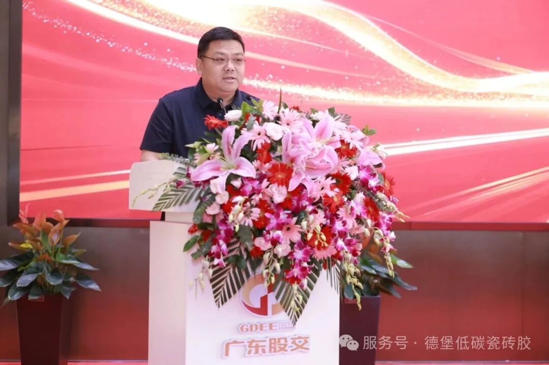 在全场热烈的掌声中,广东股权交易中心副总经理李培杰先生登台致辞,向德堡公司致以热烈的祝贺,李总表示,德堡公司成功挂牌,是企业发展历程中的重要里程碑,也体现了广东股权市场服务实体经济的又一成果。希望德堡公司以挂牌为新起点,借力资本市场资源,规范治理、做优做强,在更广阔的舞台上行稳致远。