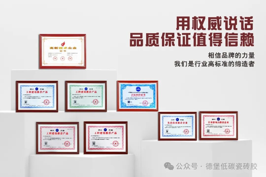21年来,德堡建材深耕绿色建材领域,以技术创新为核心驱动力,累计获得三十多项国家专利及认证,其中“低碳柔性瓷砖胶发明专利技术”成为企业核心竞争力,奠定了德堡作为低碳瓷砖胶开创者的行业地位。