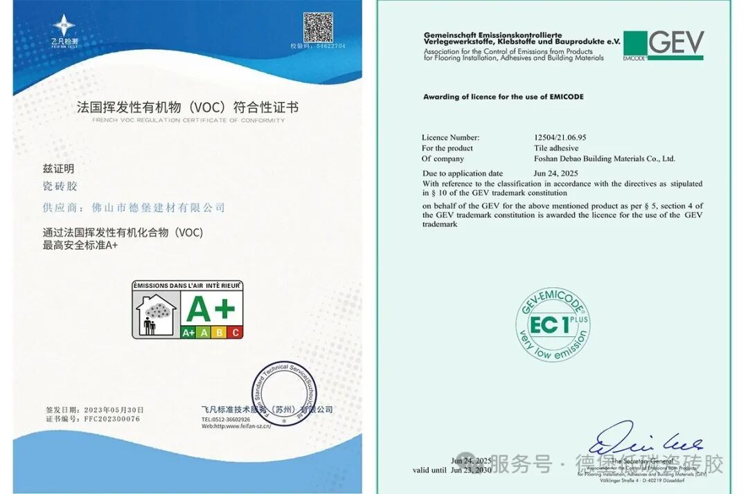 作为低碳瓷砖胶的开创者,德堡还将低碳理念贯穿生产全过程,通过全自动化生产控制系统,实现精准配比、高效生产,显著降低生产能耗与污染物排放,荣获“中国绿色建材产品”认证证书,获得国家级权威背书,彰显了企业在绿色环保领域的硬实力。同时,还通过法国A+、德国EC1PLUS等国严苛环保标准及甲醛检测,实现VOC近乎零排放,真正做到“零甲醛·更安全”,从材料源头上守护室内空气健康。