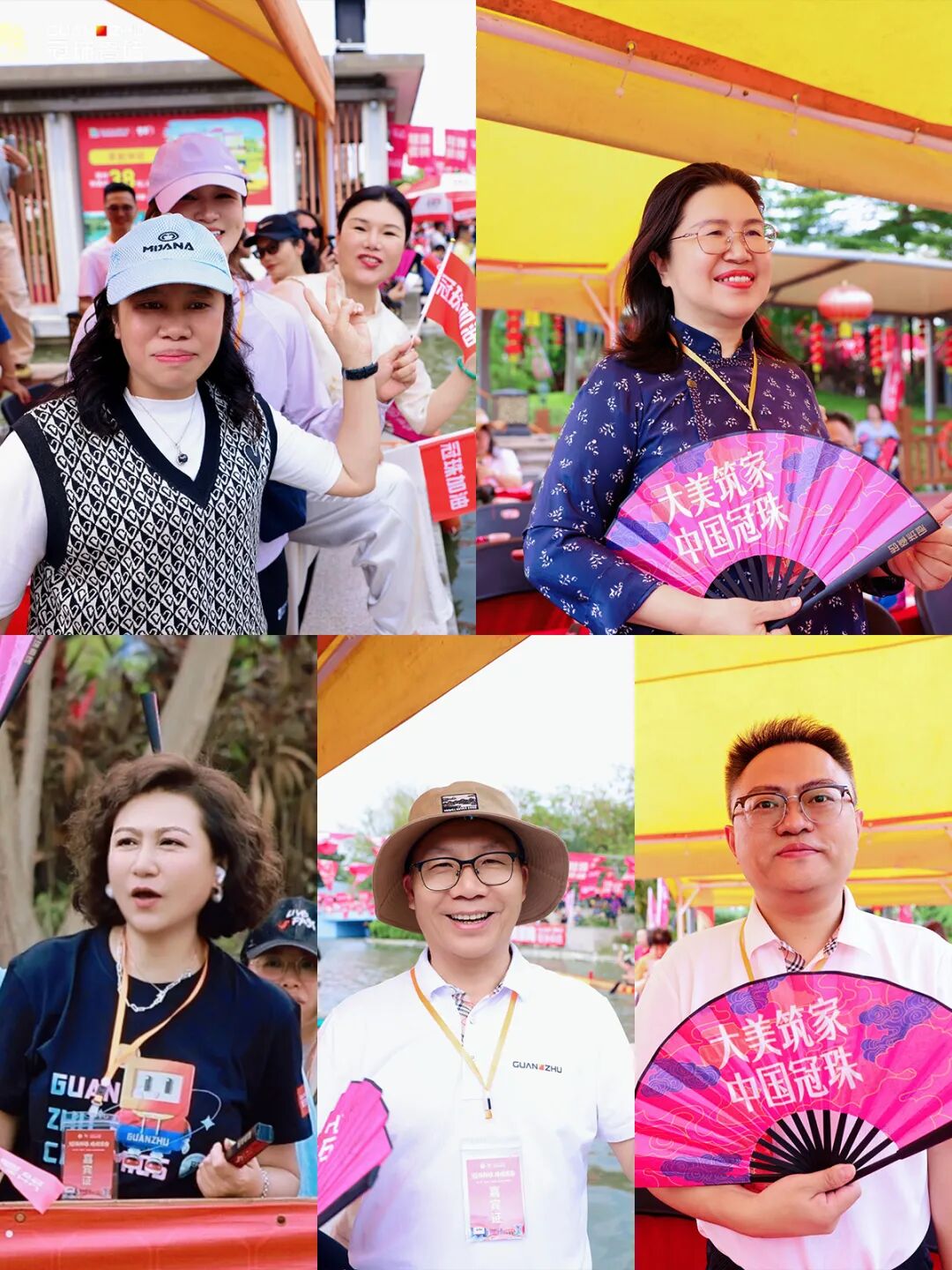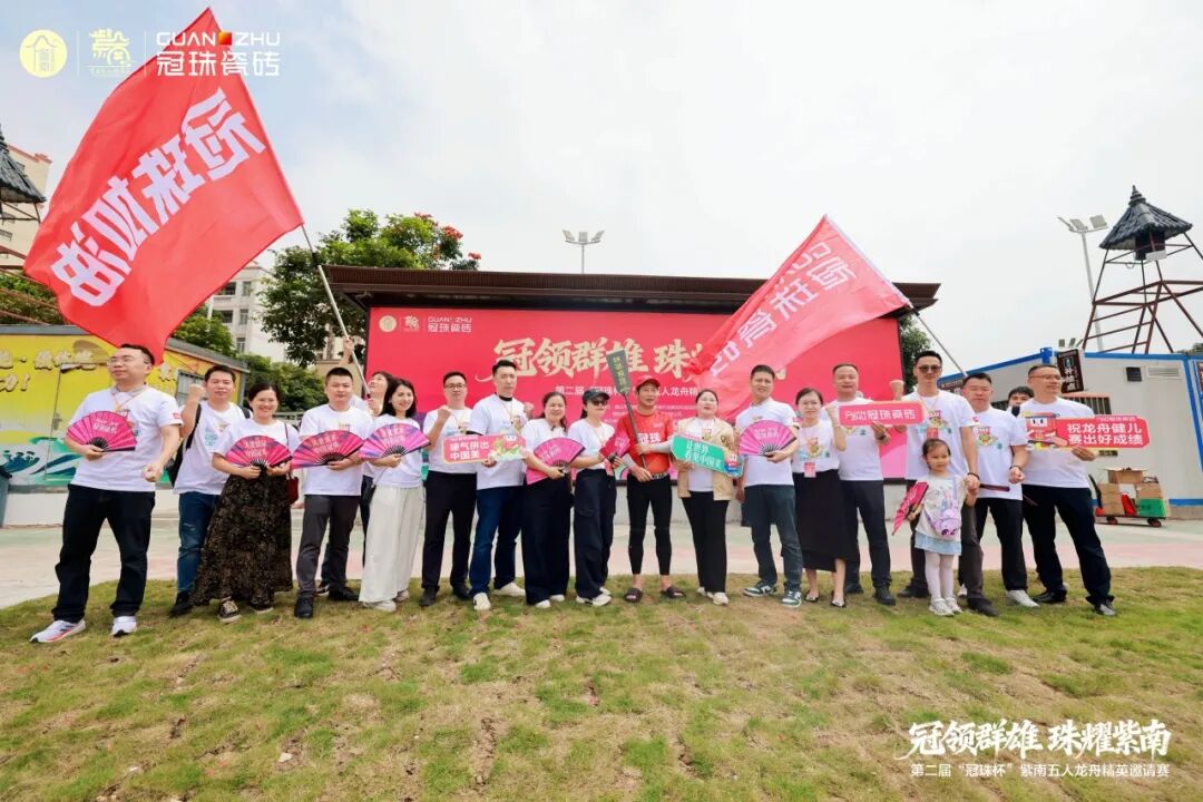 赛场上热血沸腾,赛场外同样热情不断!新明珠集团总裁梁旺娟,集团党委书记、董事、副总裁陈先辉,集团副总裁、营销管理中心总经理高颂,集团副总裁、营销管理中心副总经理韦前,冠珠瓷砖品牌总经理潘瀚等集团、品牌领导代表,以及来自全国各地的经销商代表们亲临现场,作为“冠珠瓷砖啦啦队”与当地市民一块为冠珠队加油呐喊,并在热烈的赛事中感受龙舟文化的魅力、美好乡村蓬勃向上的发展活力。