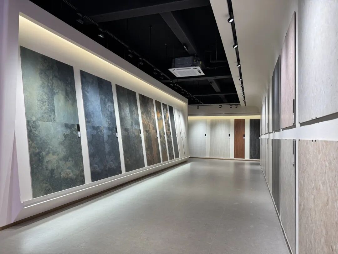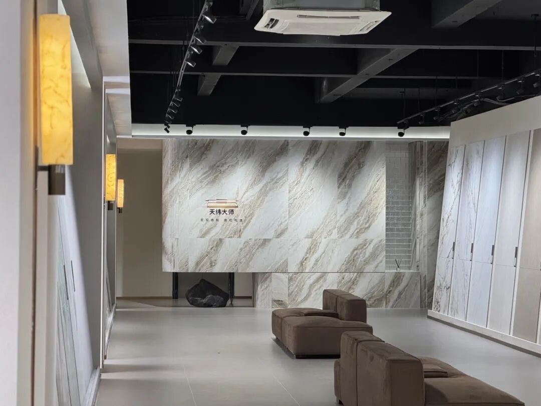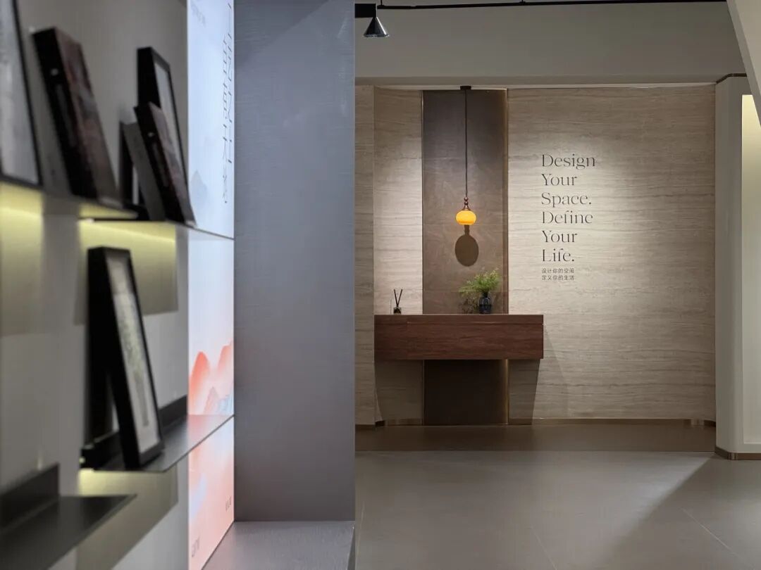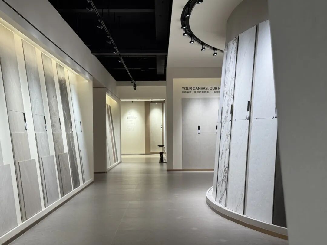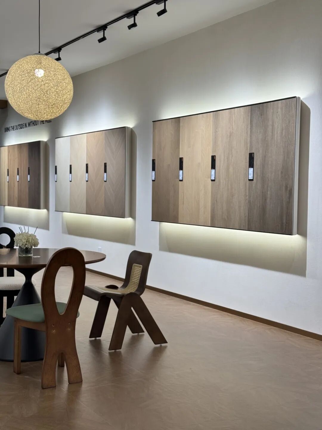 木纹砖区的温润与大理石纹的清冽,在不同的光影下,呈现出截然不同的气质。每一面展墙、每一处转角,都以克制的线条与层次,传递着“让材质回归生活”的理念,让每一步驻足,都成为与质感的深度对话。